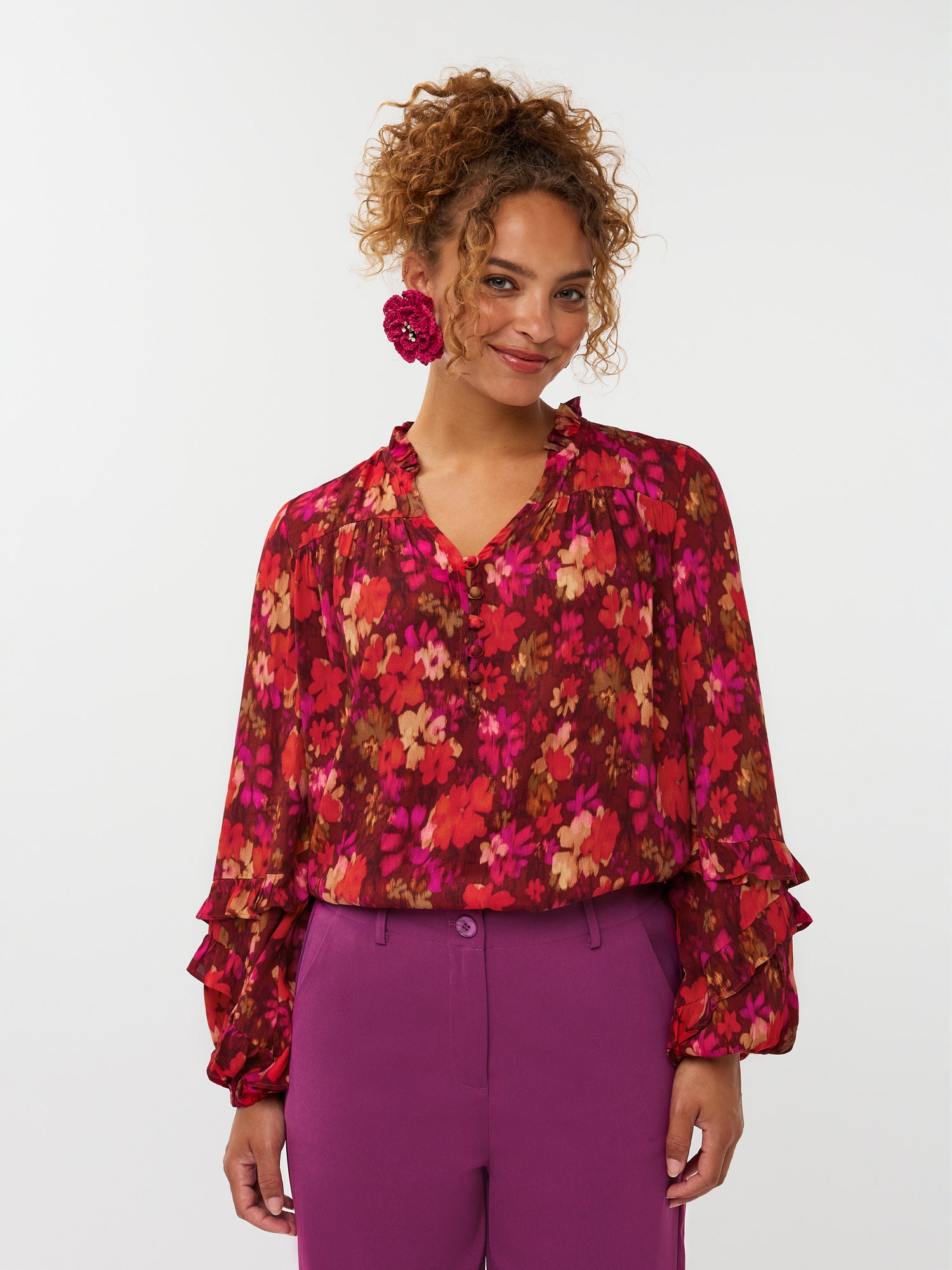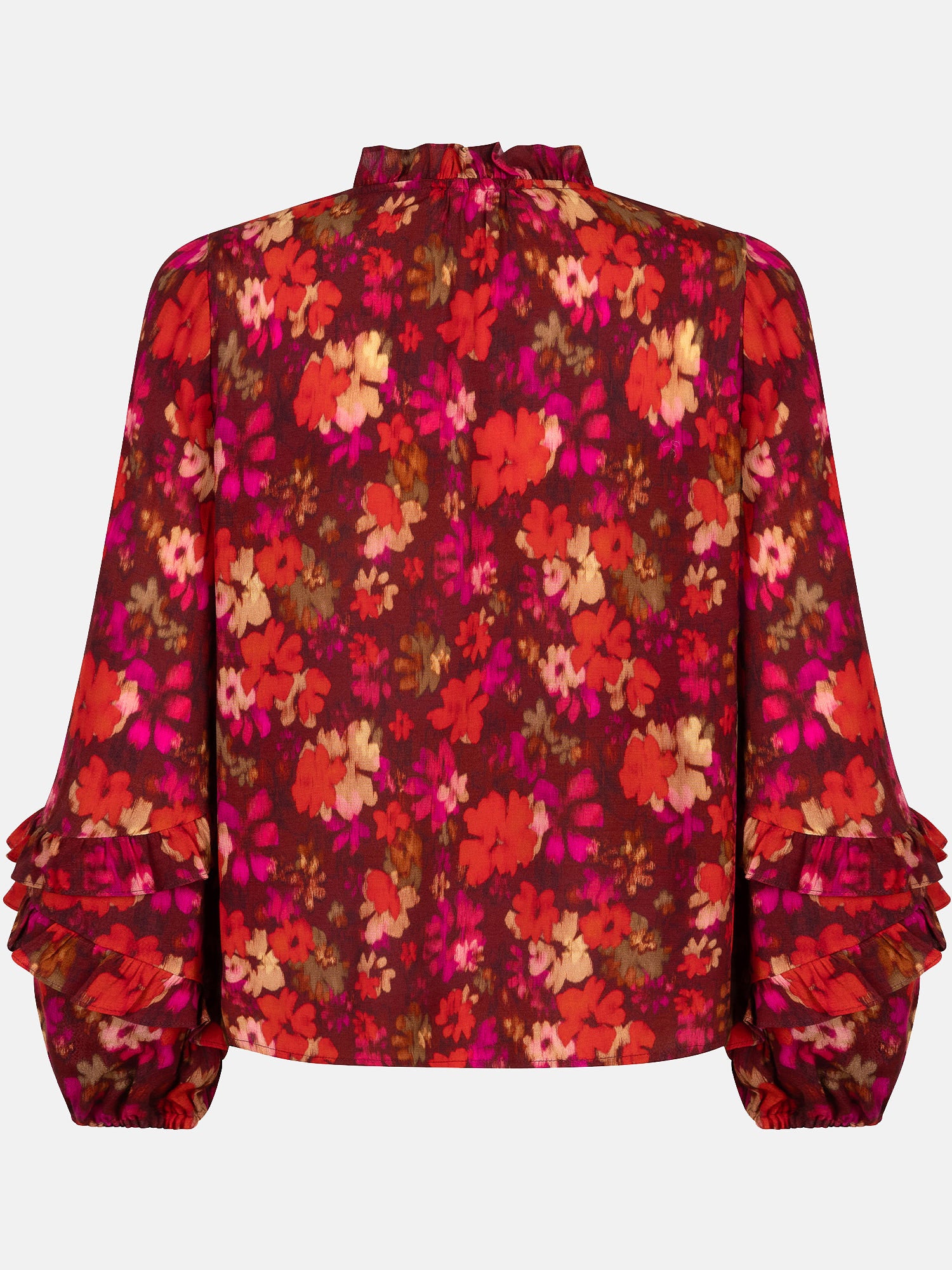 Blouse Ellie is een romantische blouse met een speelse print die je look direct opfleurt. Deze blouse heeft een losse pasvorm, een subtiel opstaand ruffle kraagje en een halve knoopsluiting aan de voorkant. De lange mouwen met dubbele ruches geven het item een vrouwelijke en trendy uitstraling. De luchtige stof zorgt ervoor dat Ellie comfortabel draagt, ideaal voor verschillende gelegenheden. De totale lengte van blouse Ellie is 60,5 cm met een mouwlengte van 61 cm bij een maat S.