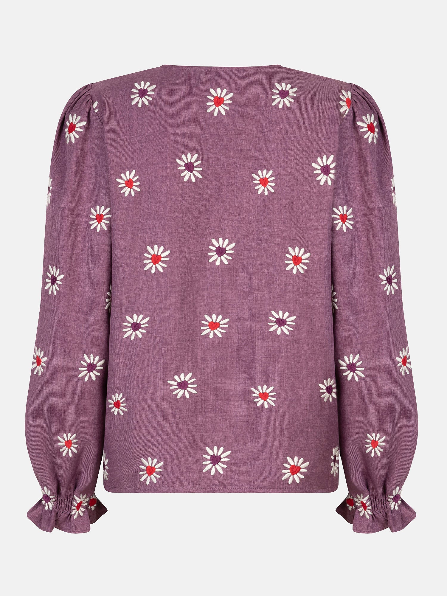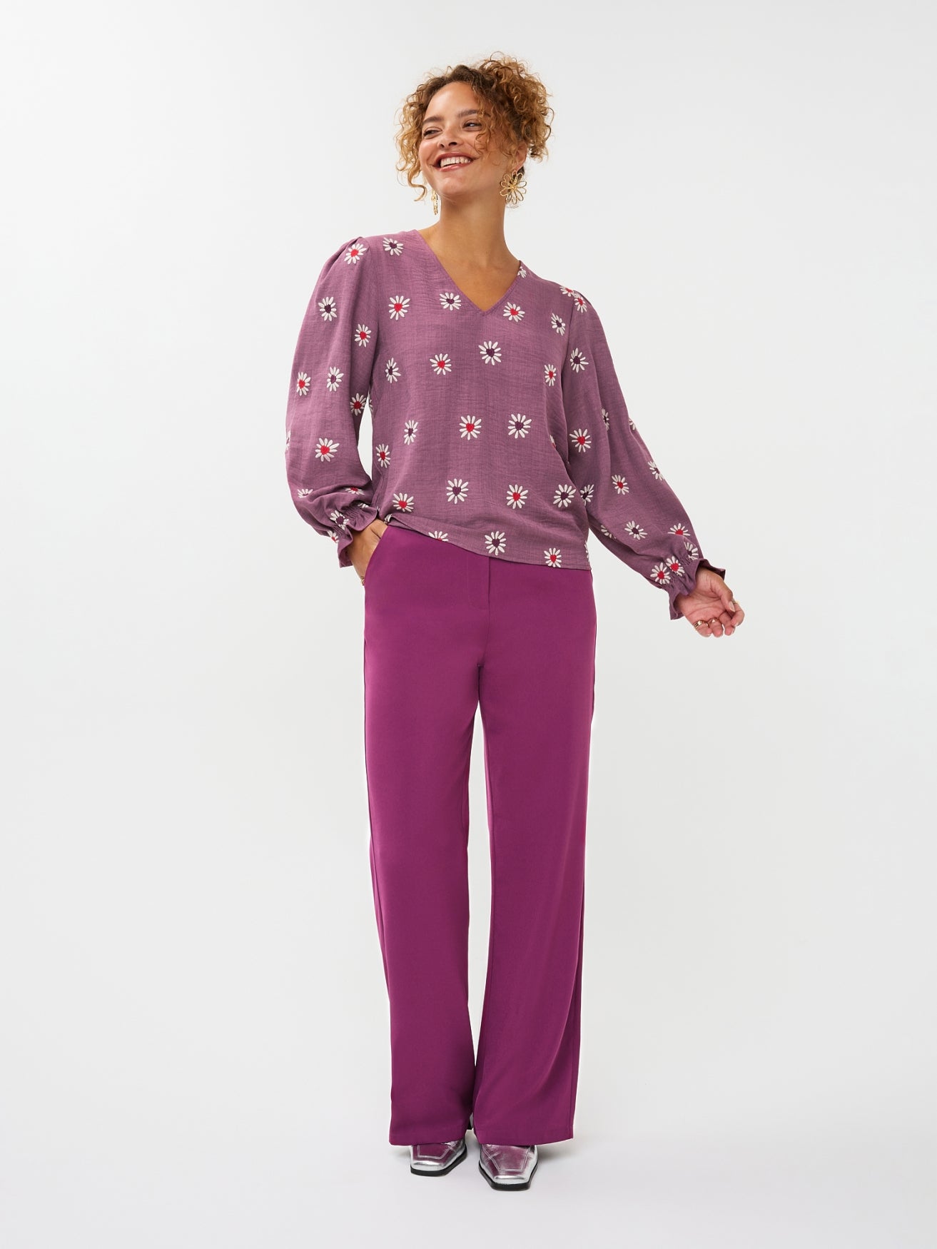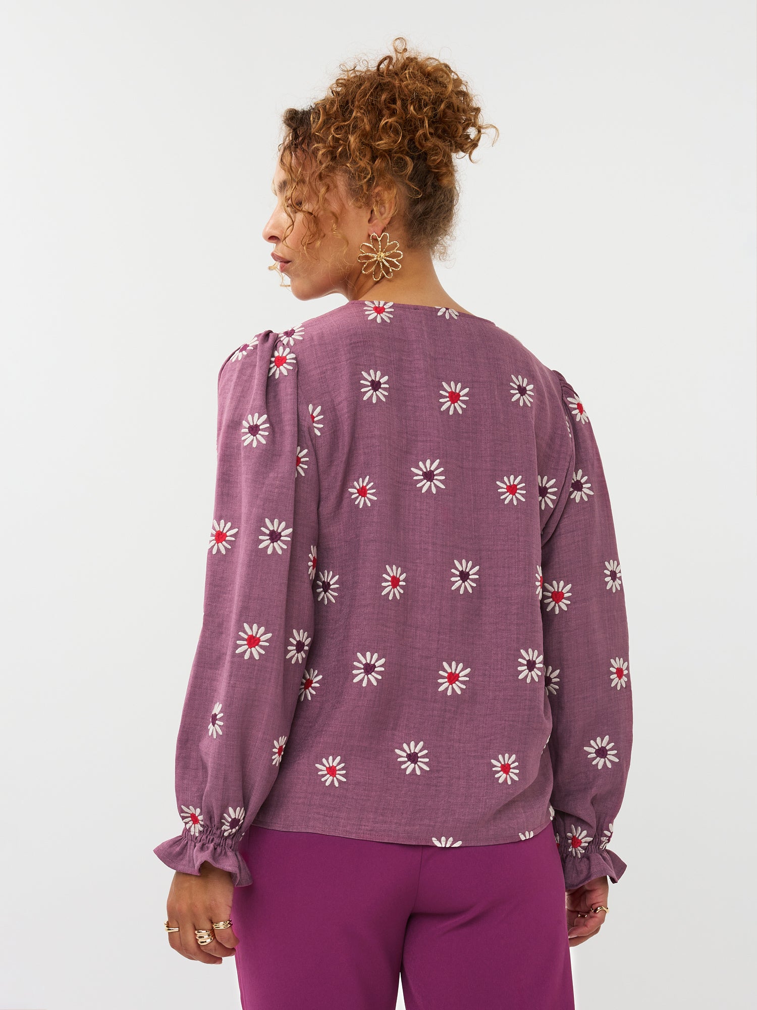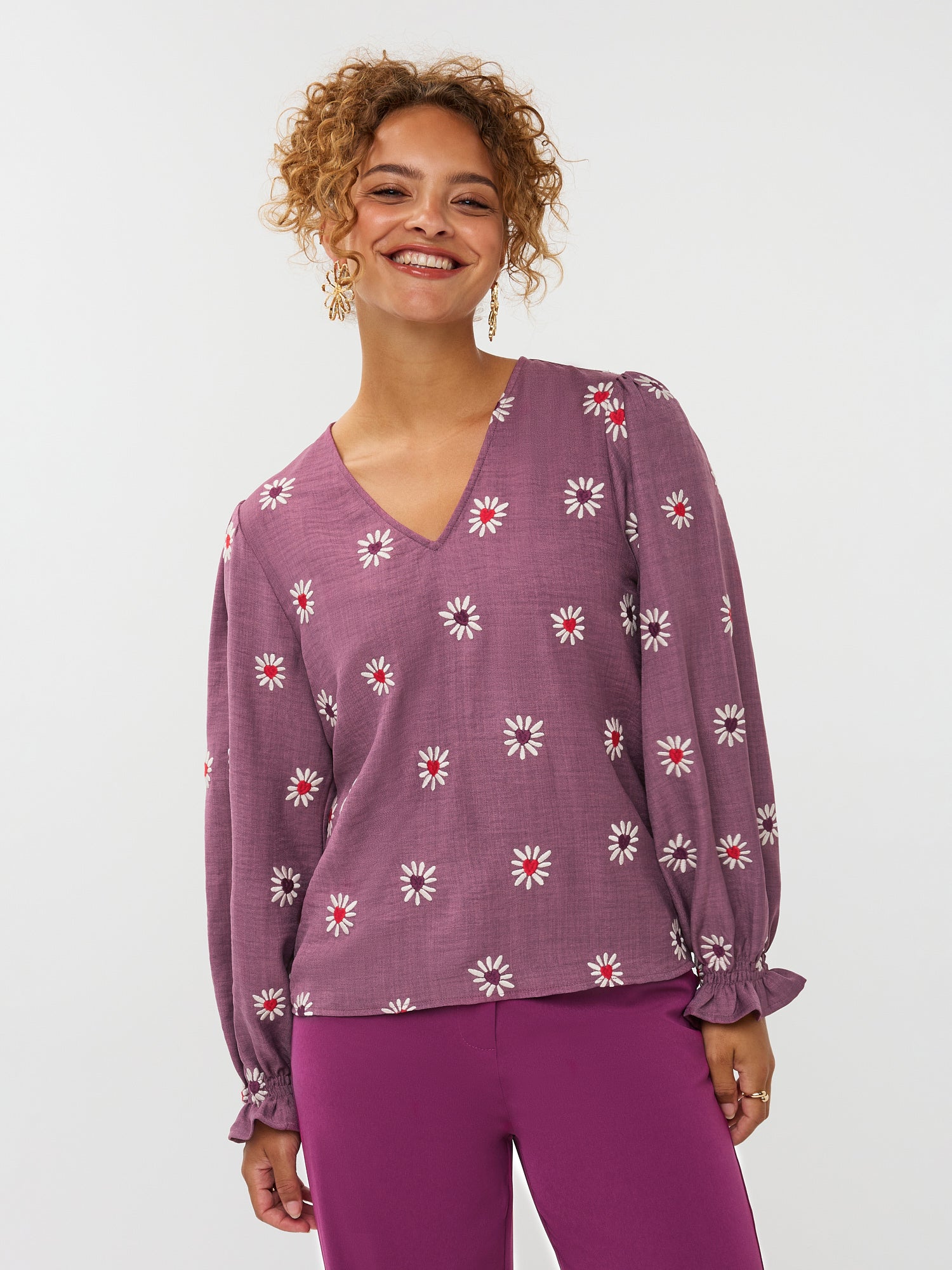 Top Philou is een vrolijke en vrouwelijke top die je look een speelse twist geeft. Deze blouse heeft een rechte, losse pasvorm met een diepe V-hals en lange mouwen. De elastische ruches aan de manchetten zorgen voor een charmant detail. Het all-over geborduurde bloemetjesspatroon voegt een frisse en speelse uitstraling toe aan het item. De totale lengte van top Philou is 62 cm met een mouwlengte van 62 cm bij een maat S.