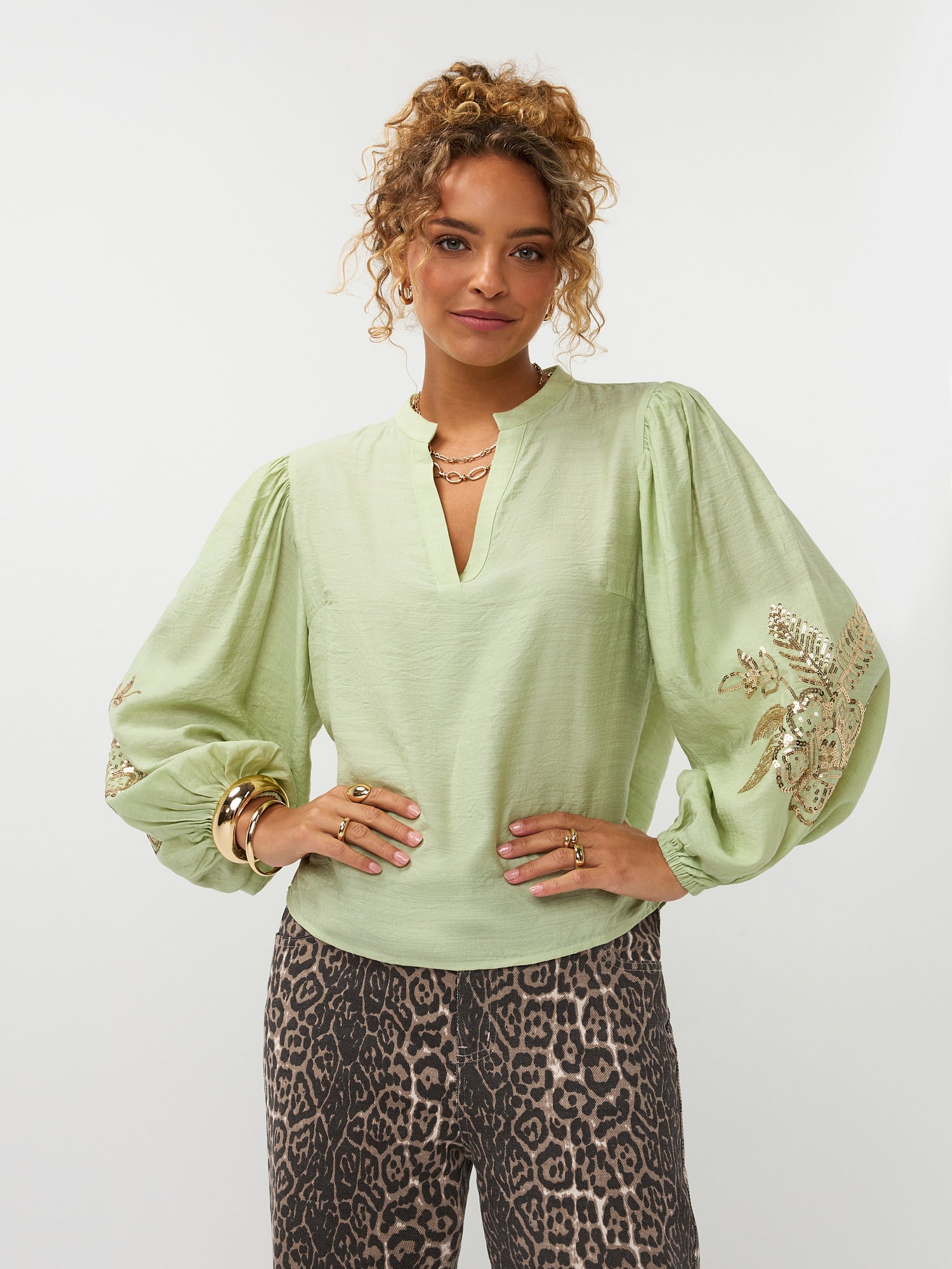 Blouse Rose is een elegante en verfijnde blouse met een linnenlook. De echte blikvanger van deze blouse zijn de mouwen. De lange, gepofte mouwen zijn verrijkt met een verfijnd paillettenpatroon in een sierlijke bloem- en bladstructuur. De goudkleurige pailletten zijn zorgvuldig aangebracht en zorgen voor een subtiel sprankelend effect dat prachtig contrasteert met de rustige, lichte basis van de stof. De totale lengte van Blouse Rose is 62 cm met een mouwlengte van 61 cm bij een maat S.