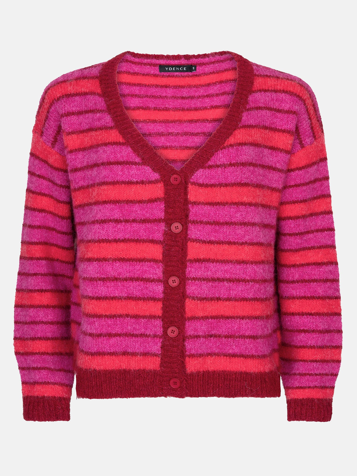 The Ginny cardigan is a cheerful and cozy addition to your wardrobe. This cardigan has an oversized fit with a deep V-neck and closes with a row of buttons at the front. The striped pattern in warm shades of red and fuchsia gives the piece a playful and trendy look. The soft knit fabric ensures ultimate comfort and makes Ginny perfect for layering.