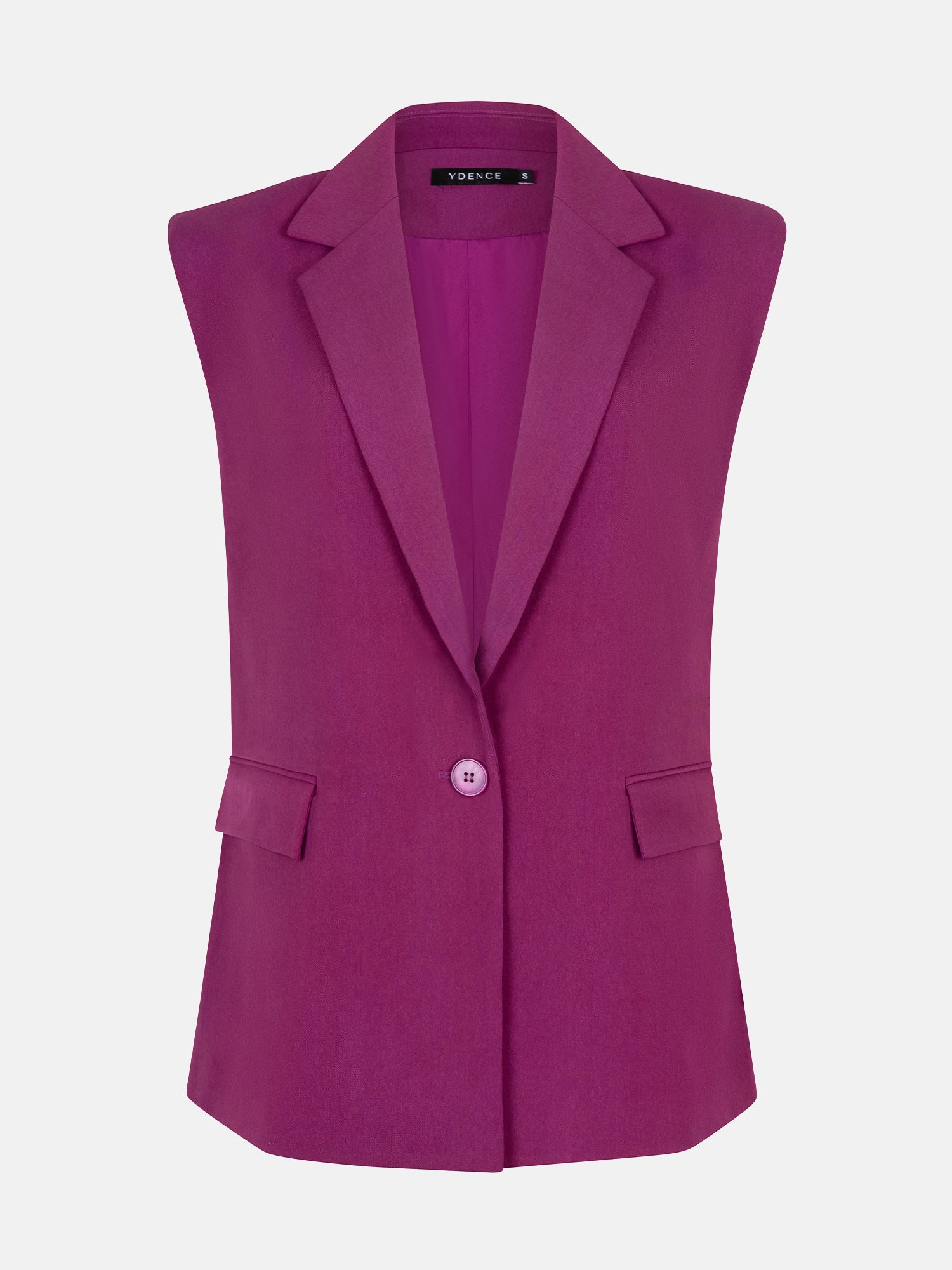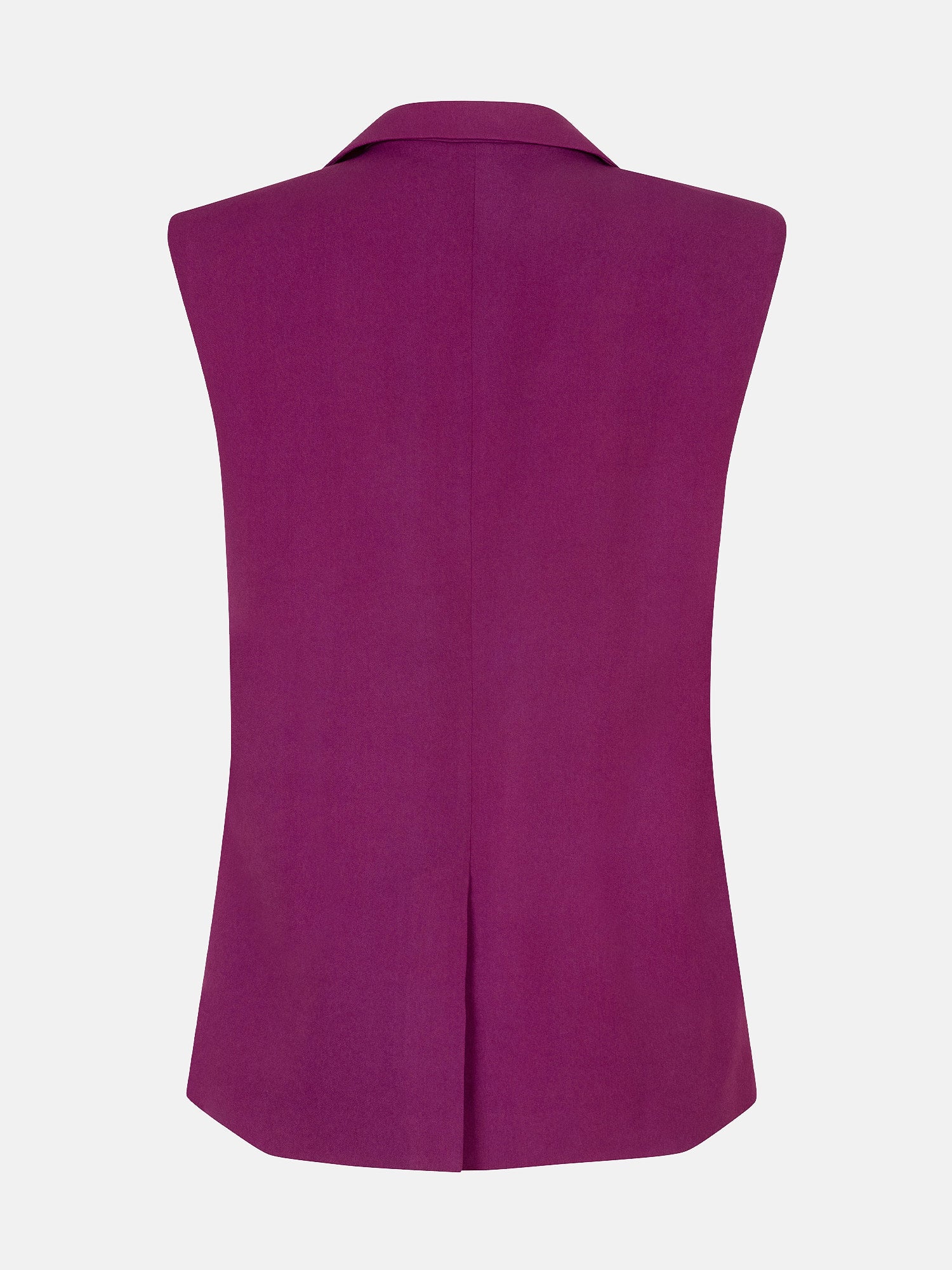 The Lima vest is a stylish and feminine vest with padded shoulders. It has a slightly oversized fit, welt pockets with flaps at the front, and closes with a single button at the front. Made of a rich polyester and rayon fabric, it is fully lined. There is a small slit at the back. The Lima vest is 72 cm long in a size S.