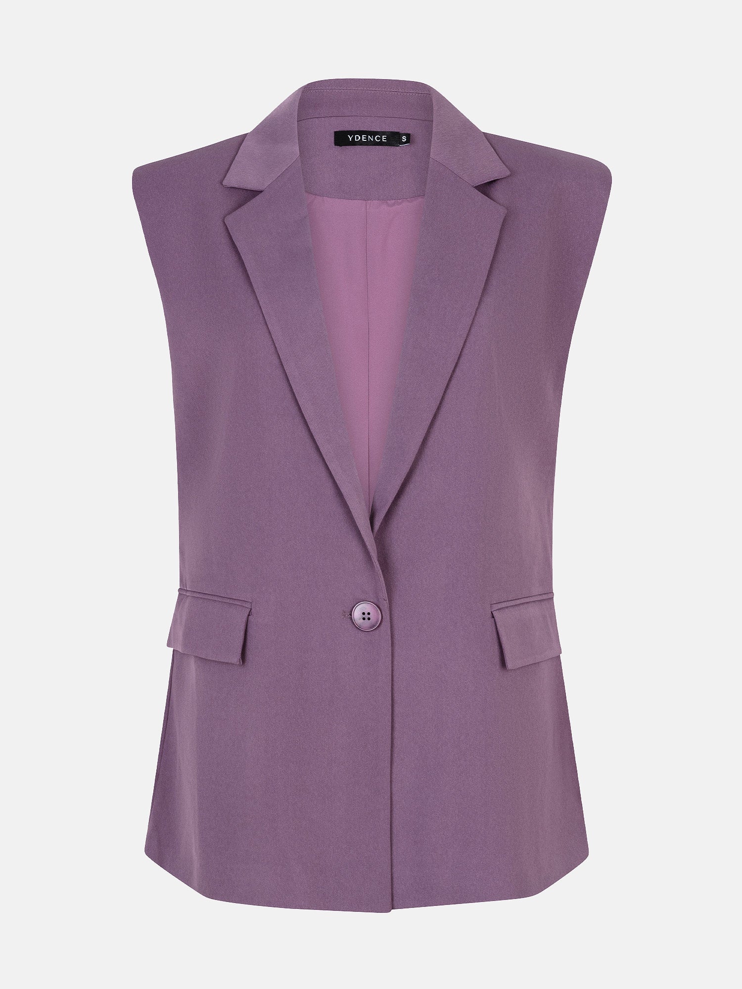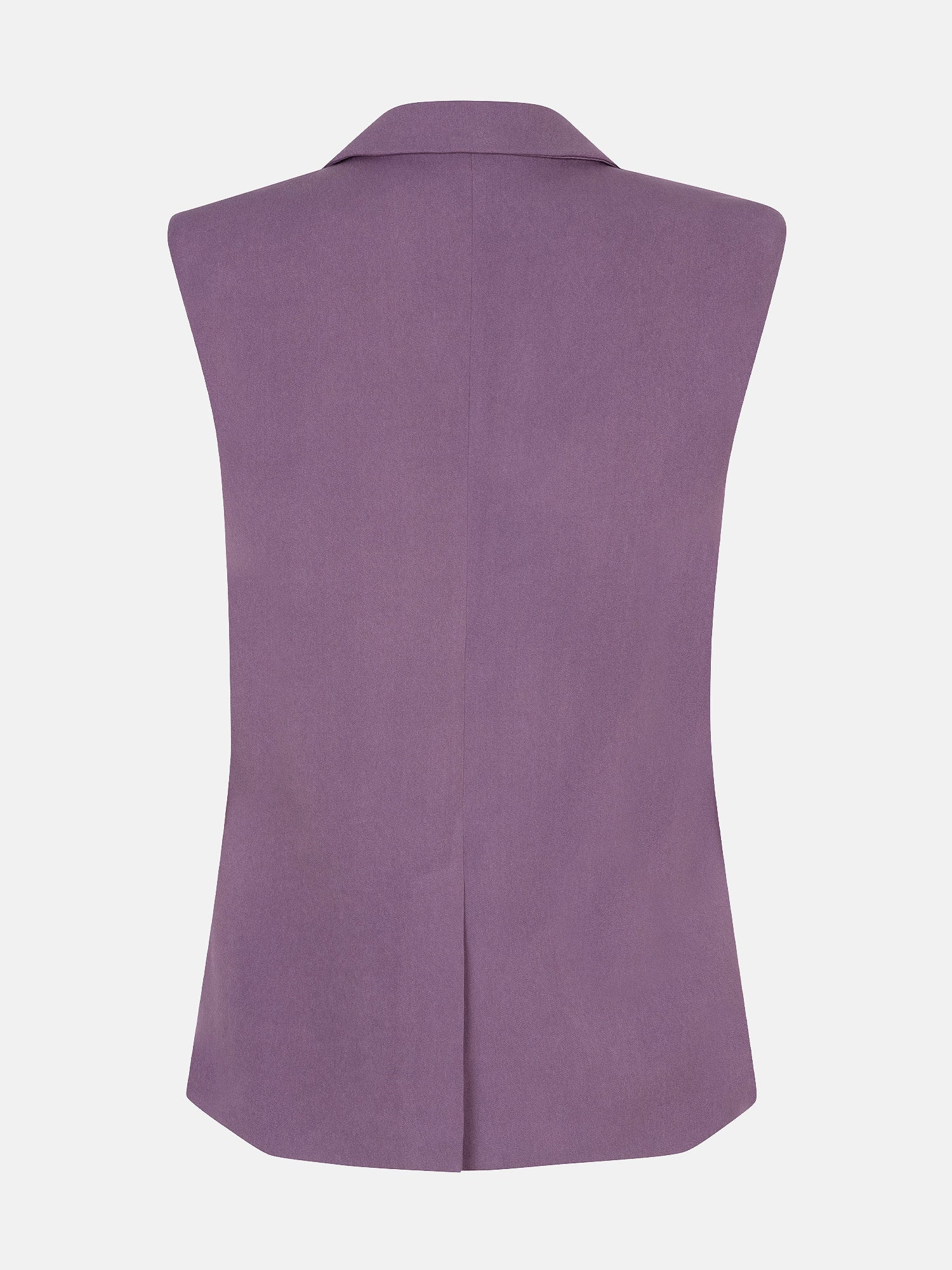 The Lima vest is a stylish and feminine vest with padded shoulders. It has a slightly oversized fit, welt pockets with flaps at the front, and closes with a single button at the front. Made of a rich polyester and rayon fabric, it is fully lined. There is a small slit at the back. The Lima vest is 72 cm long in a size S.