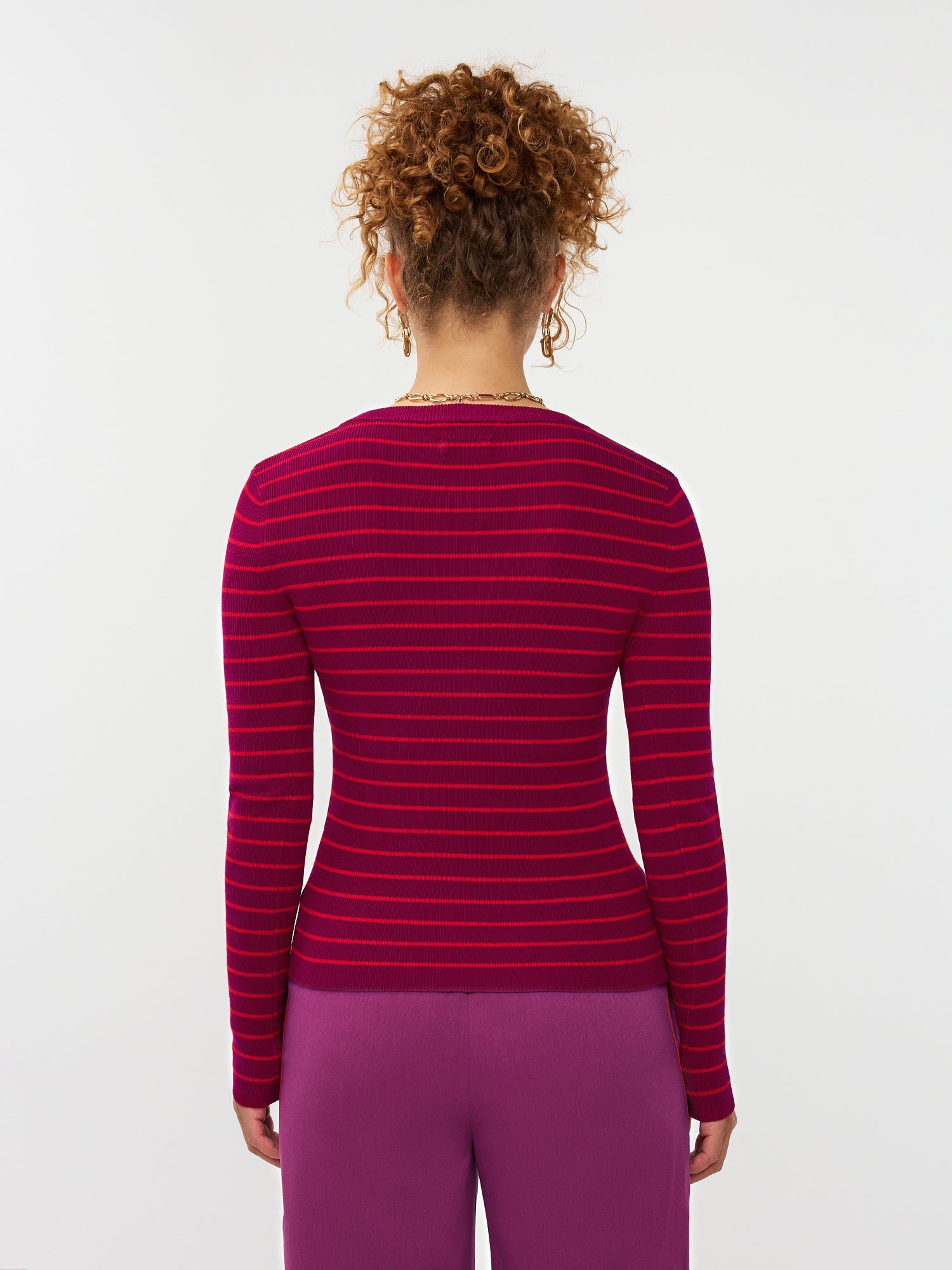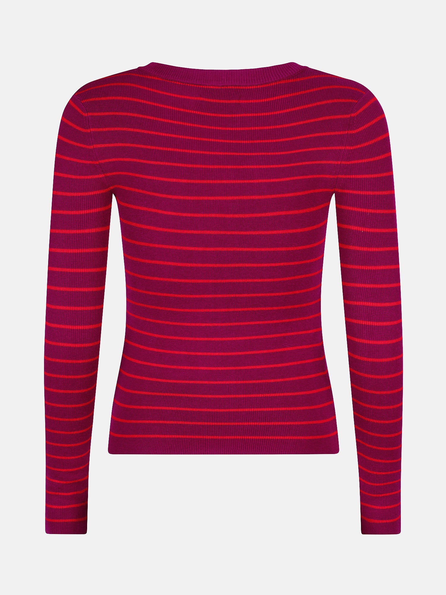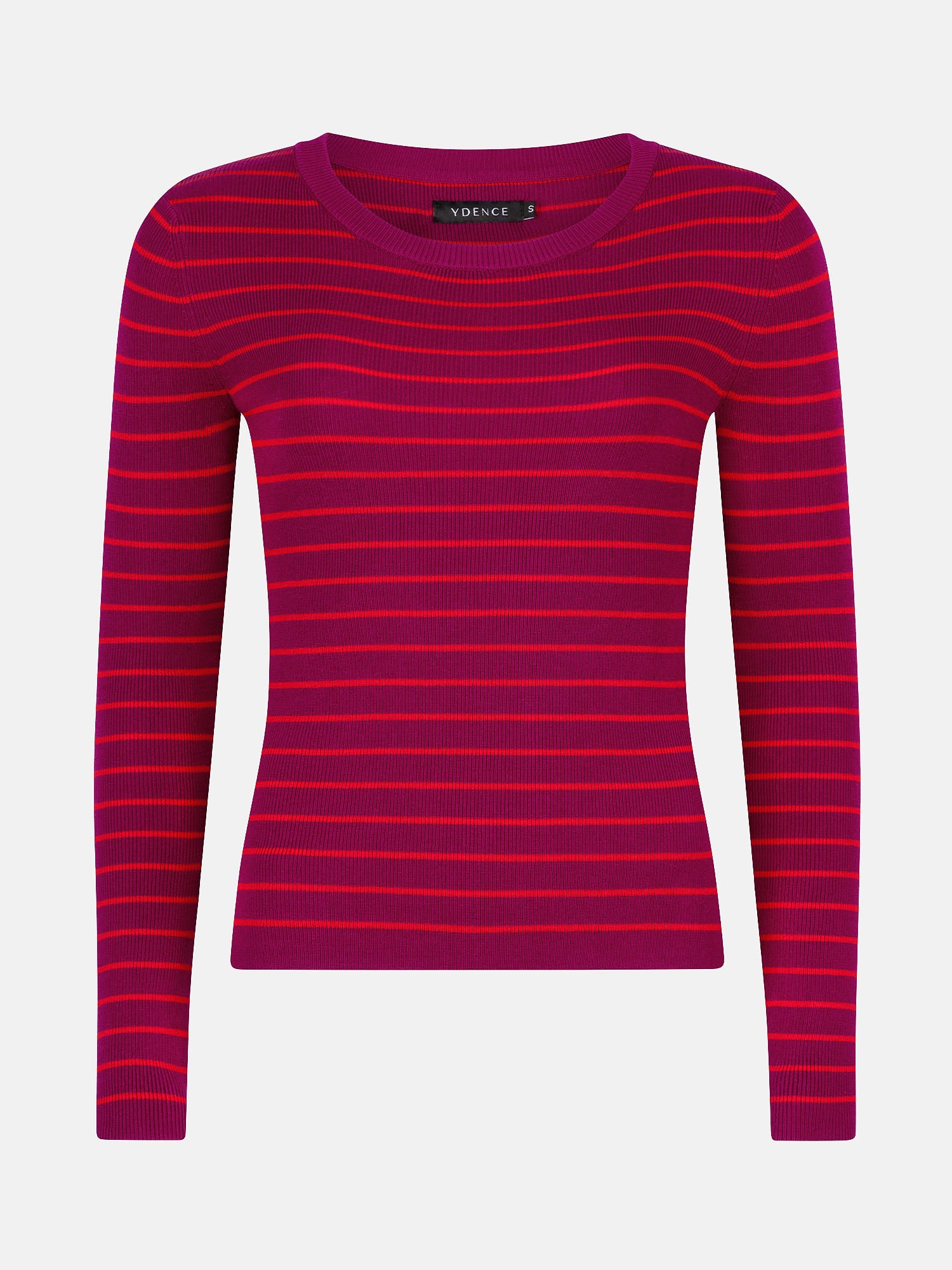 The Devina knitted top is a classic basic with a playful twist. This finely knitted top has a fitted silhouette and features a subtle striped pattern. The round neck and long sleeves create a timeless silhouette, while the stretchy fabric ensures ultimate comfort. Perfect for both casual and chic styles. The total length of the Devina knitted top is 56.5 cm with a sleeve length of 62 cm in a size S.