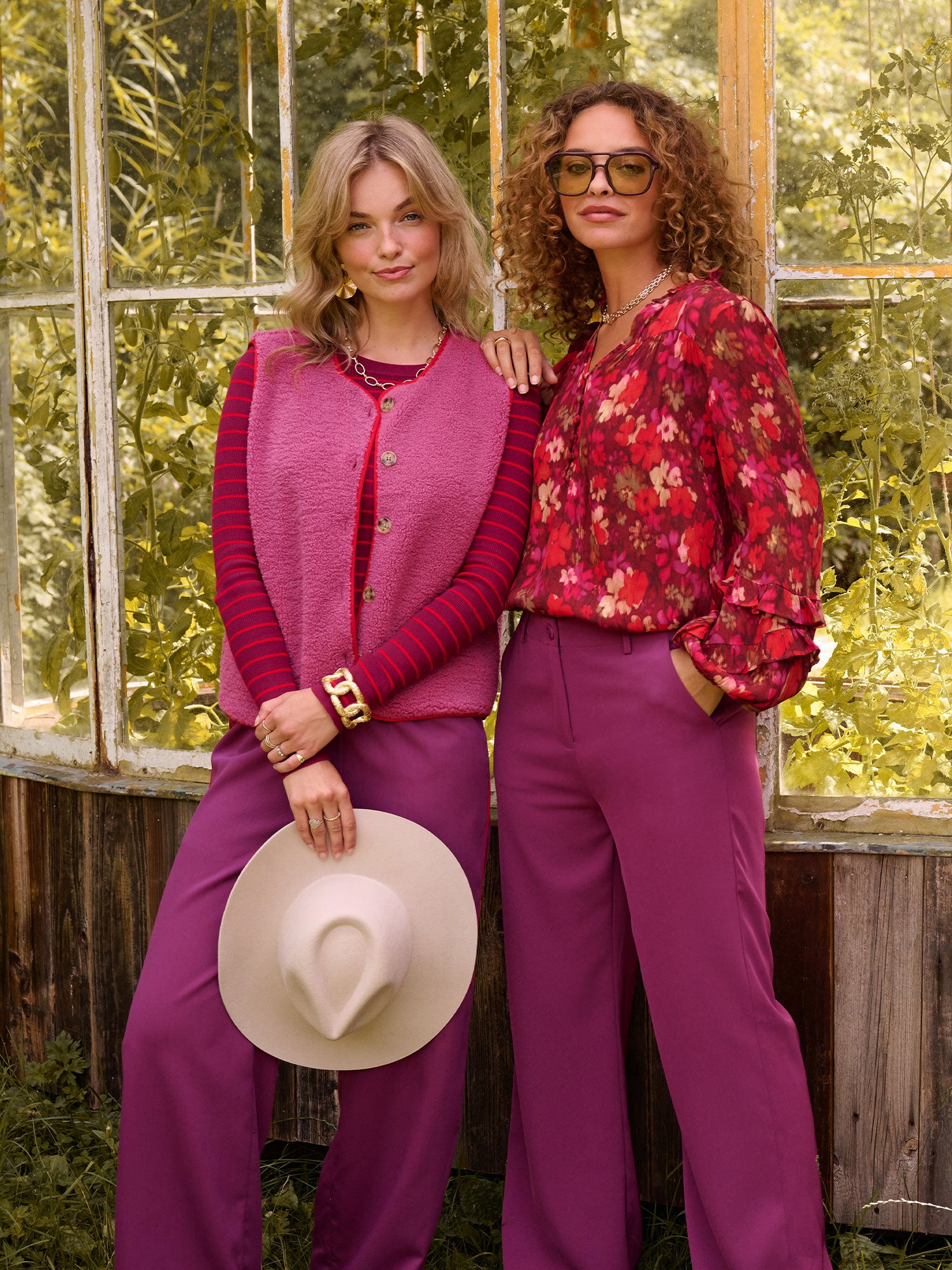 ✔ Available in mud/ecru, mauve/ecru and fuschia purple/red.