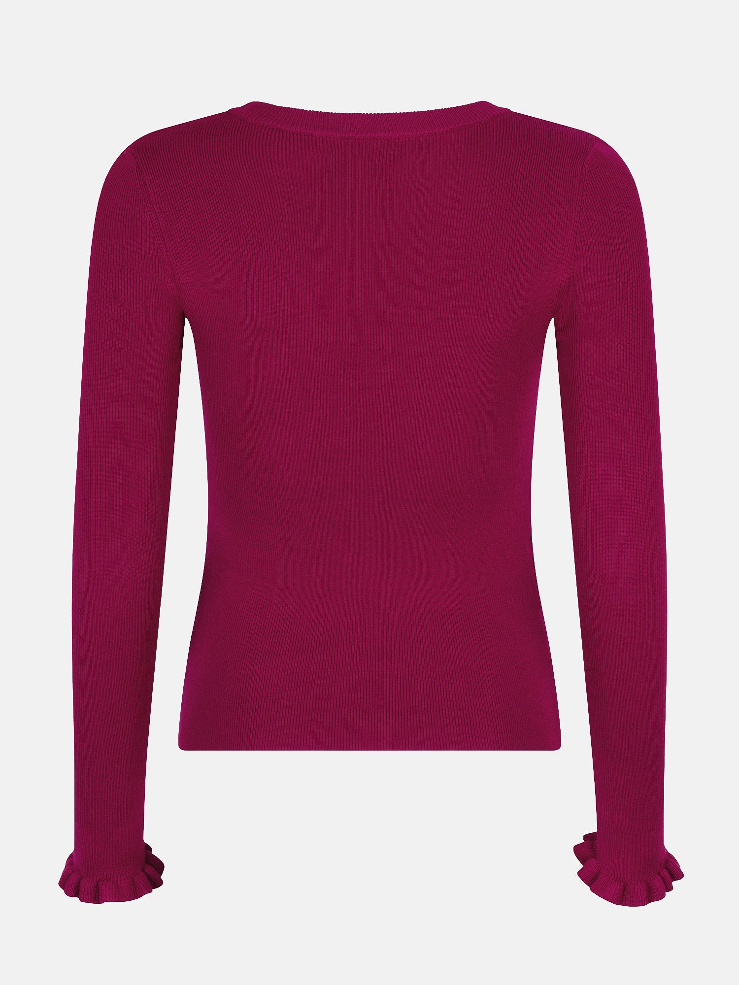 The knitted Shirley top is an elegant basic with a playful detail. This fitted top features long sleeves and a round neckline, creating a timeless silhouette. The subtle scalloped edges at the cuffs give it a feminine and contemporary touch. Made from a comfortable, fine-knit fabric, this top is ideal for both work and play. The total length of the knitted Shirley top is 56.5 cm with a sleeve length of 62 cm in a size S.