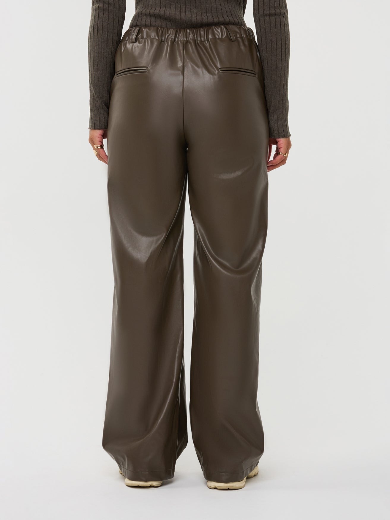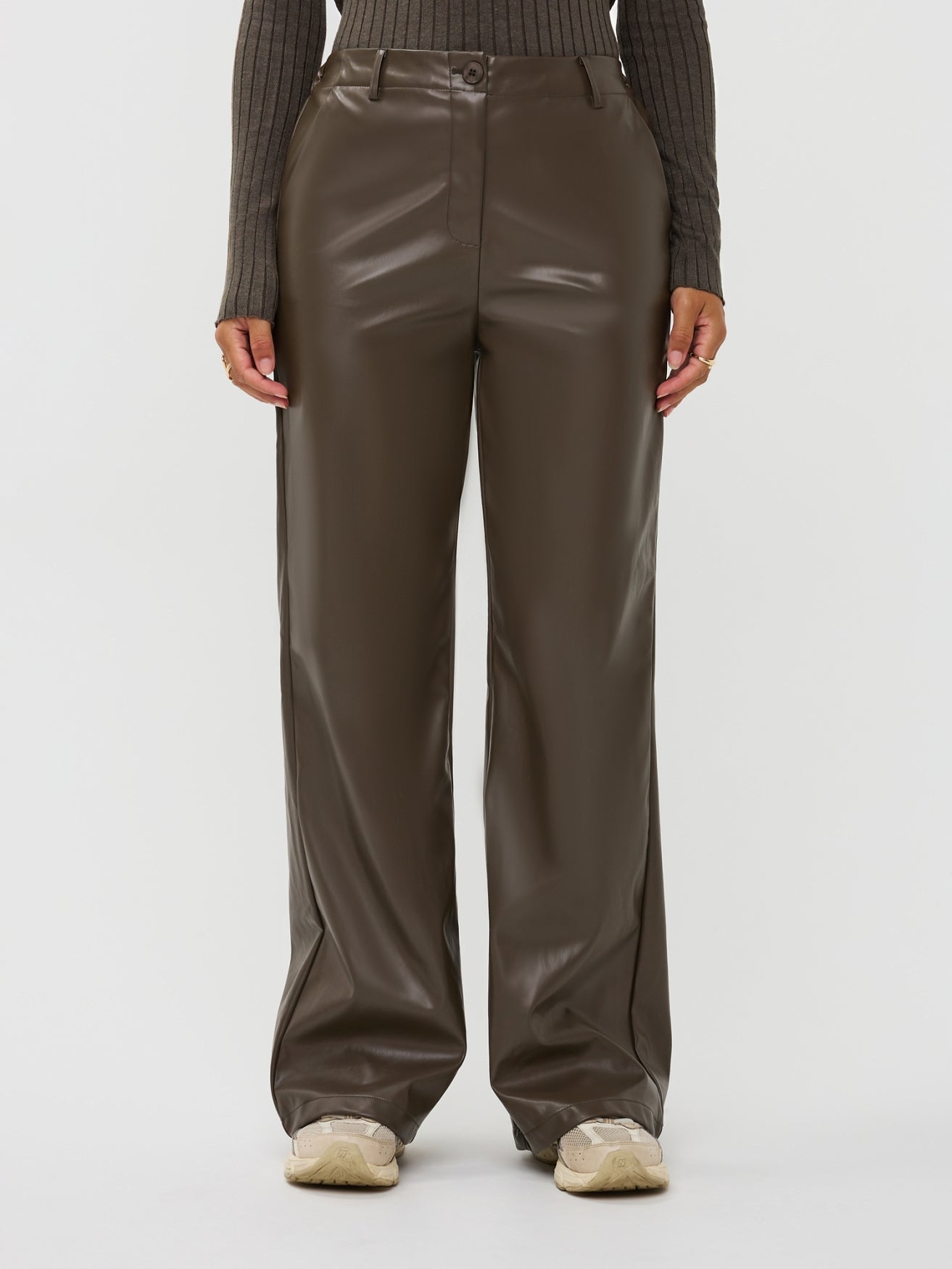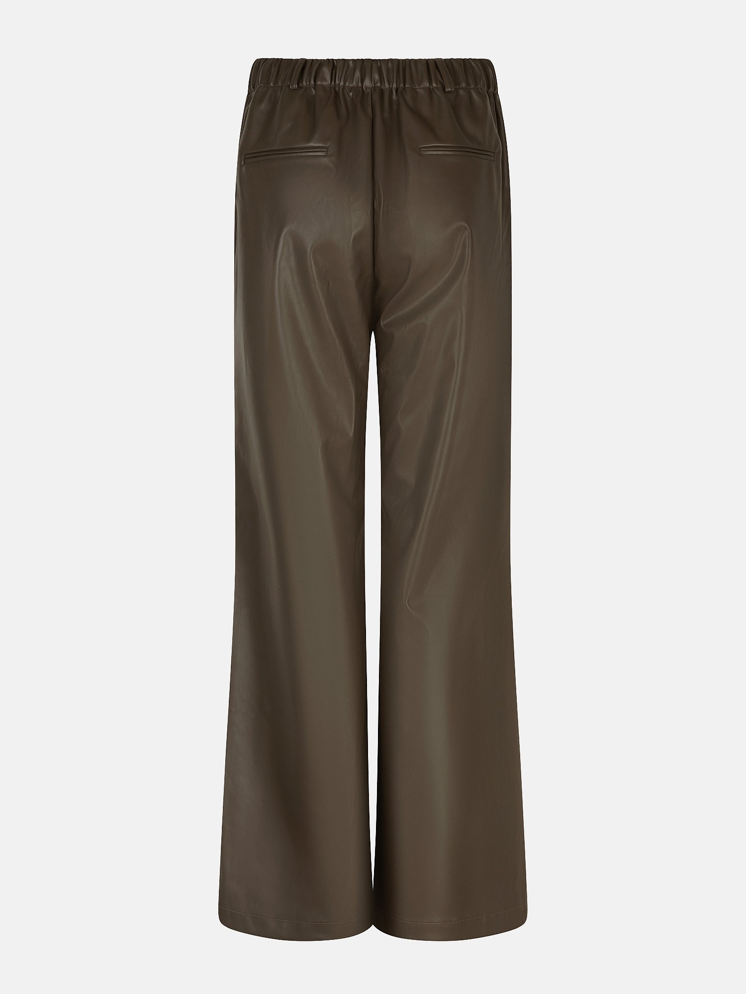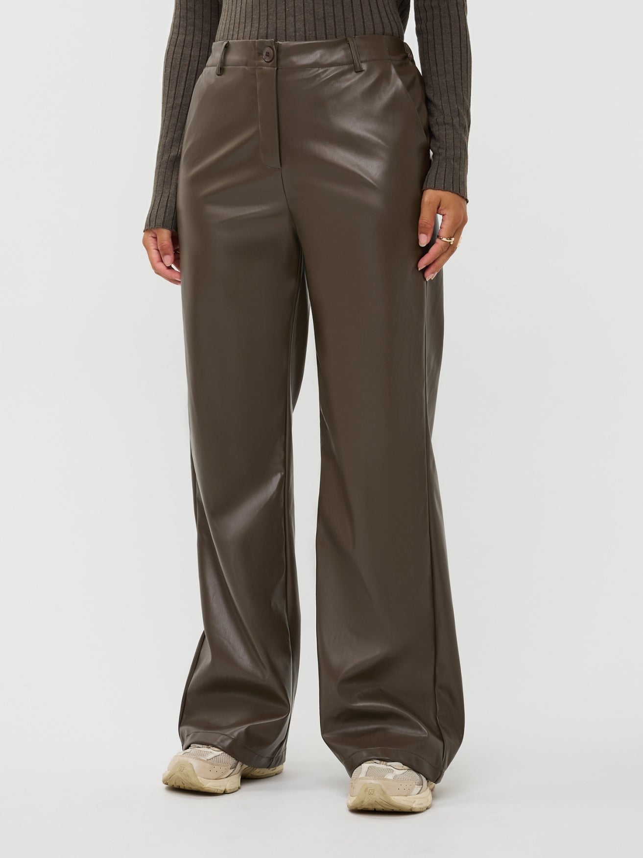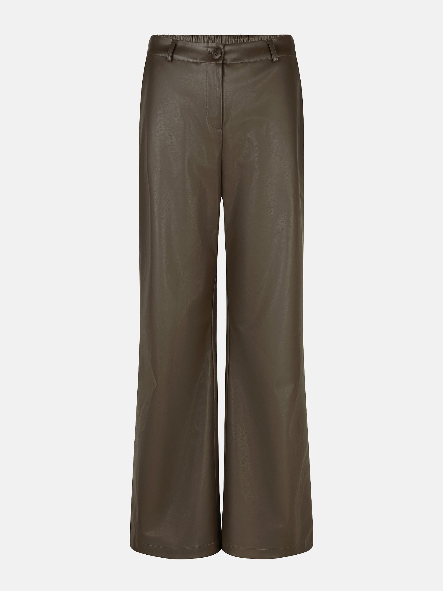 Pants Marlee are rugged and stylish leather pants that add an edgy touch to your outfit. These pants have a straight, wide fit and are crafted from a smooth faux leather fabric. The elasticated waistband at the back provides extra comfort, while the button and zip closure at the front offer a sleek finish. Perfect for both casual and chic styling. The length of the pants is 108 cm and the inseam is 80 cm in a size S.