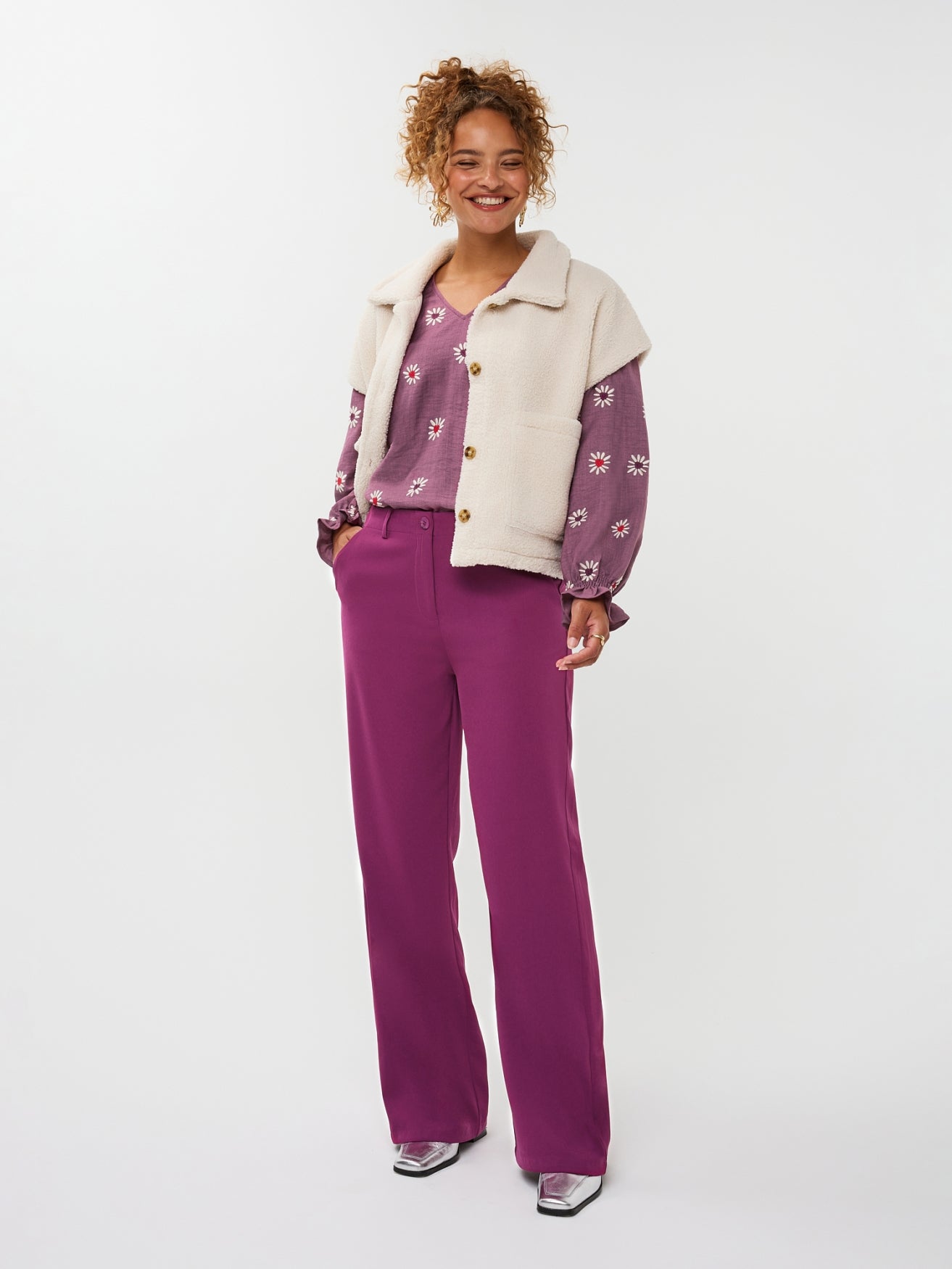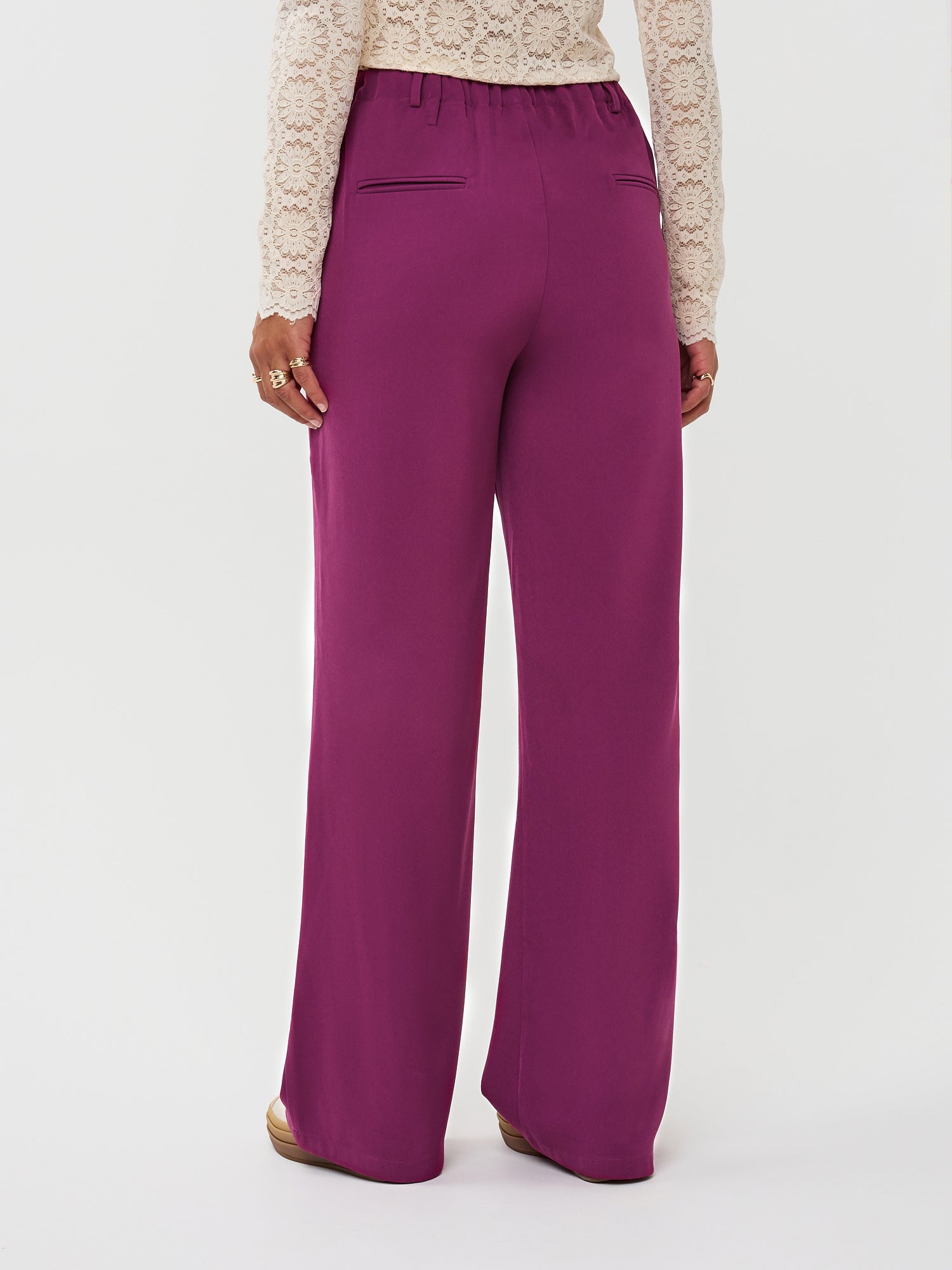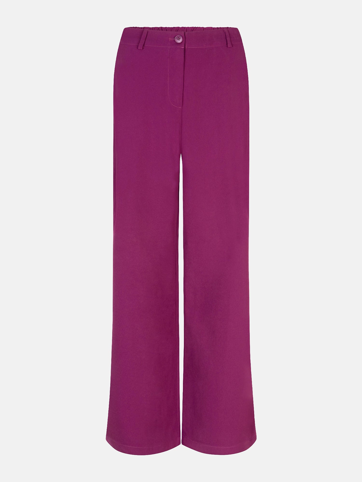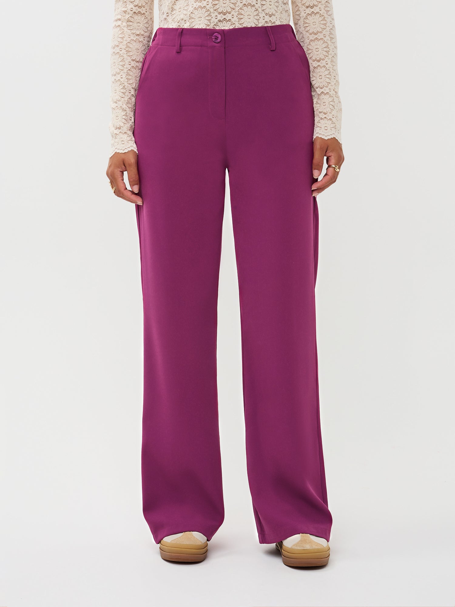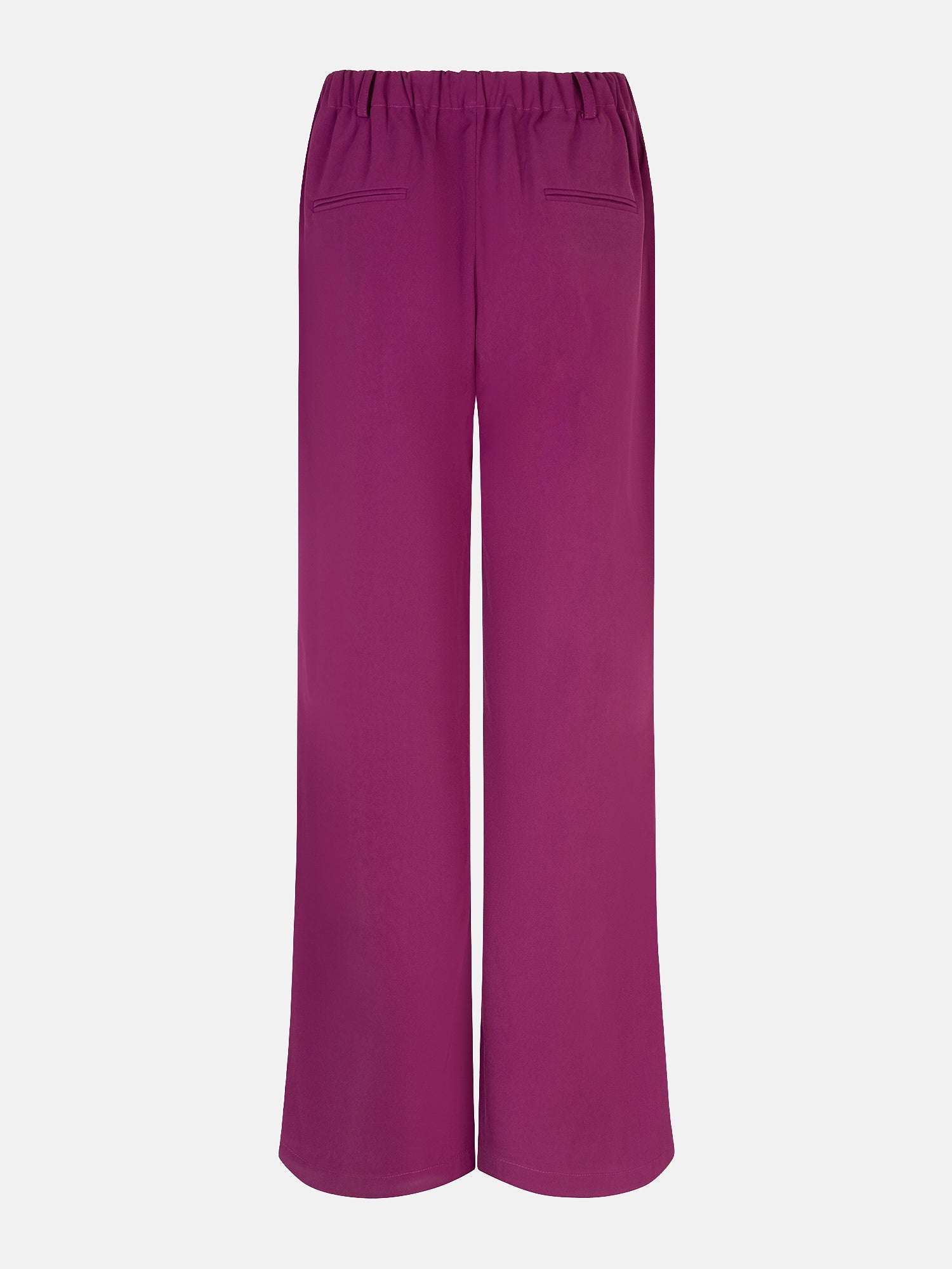 Pants Solange are elegant trousers with wide, straight legs. They feature slit pockets at the front and faux pockets at the back. They close with a button and zipper and have an elasticated waistband at the back. They are made of a rich fabric consisting of polyester and rayon. The length is 108 cm and the inseam is 80 cm for a size S.