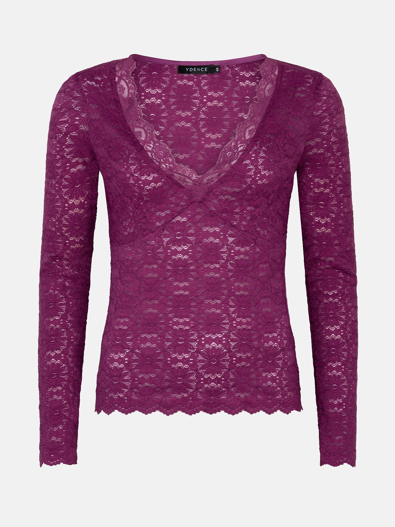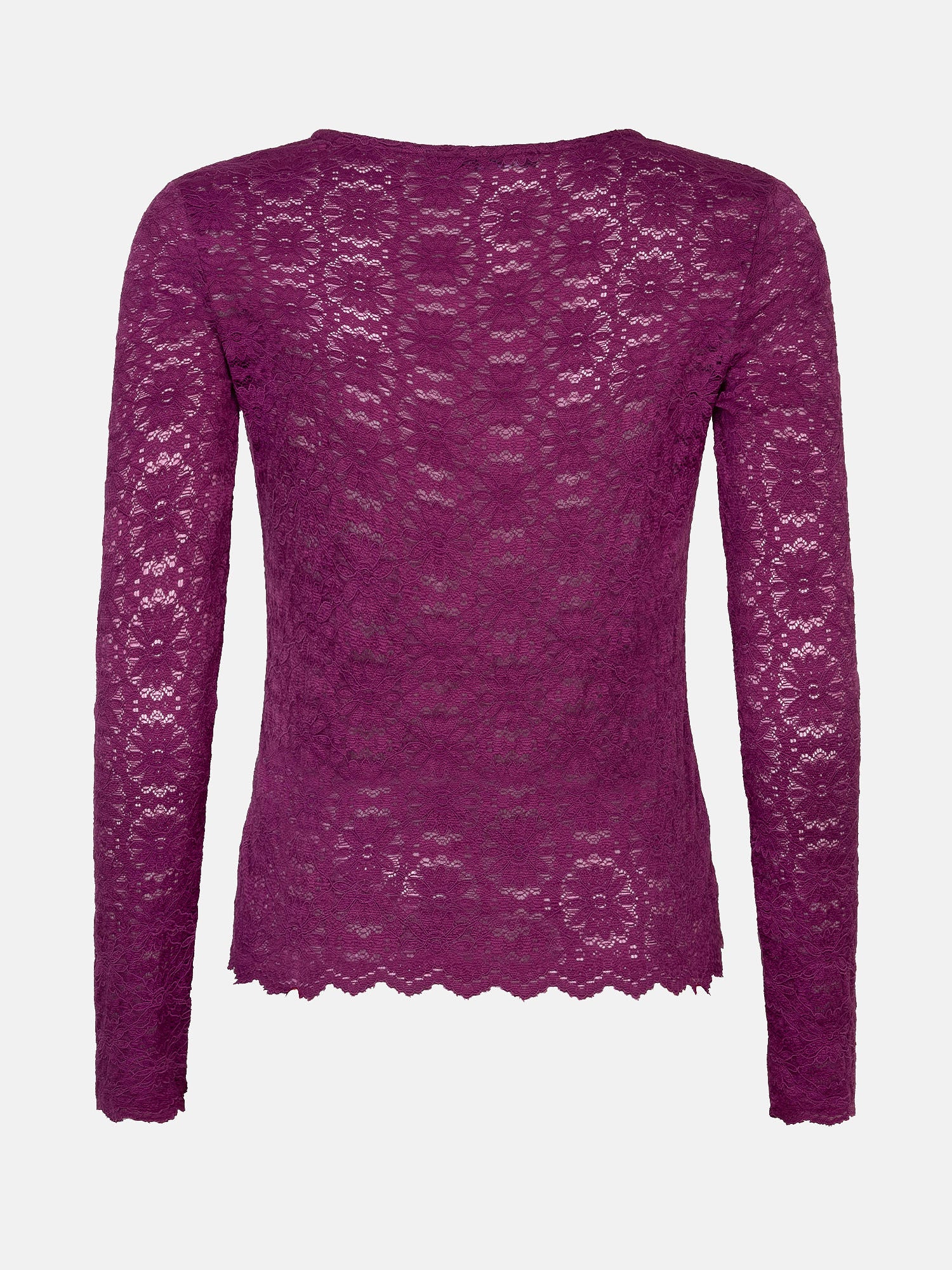 The Melissa top is a romantic and feminine top that adds an elegant touch to your outfit. This fitted top is made entirely of lace and features long sleeves and a deep V-neck with subtle trim. The floral patterns and scalloped edges give it a refined look, while the soft, stretchy fabric ensures ultimate comfort. The Melissa top is 61 cm long with a sleeve length of 62 cm in a size S.