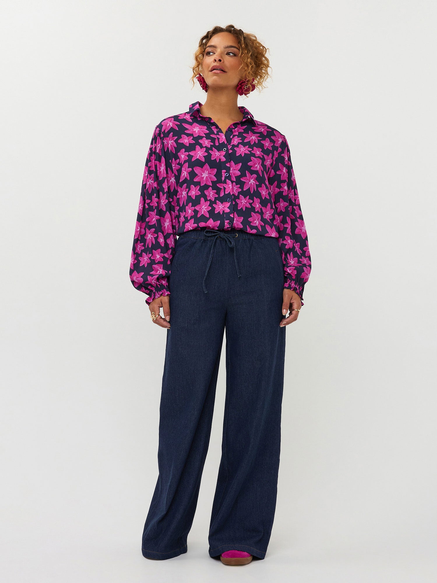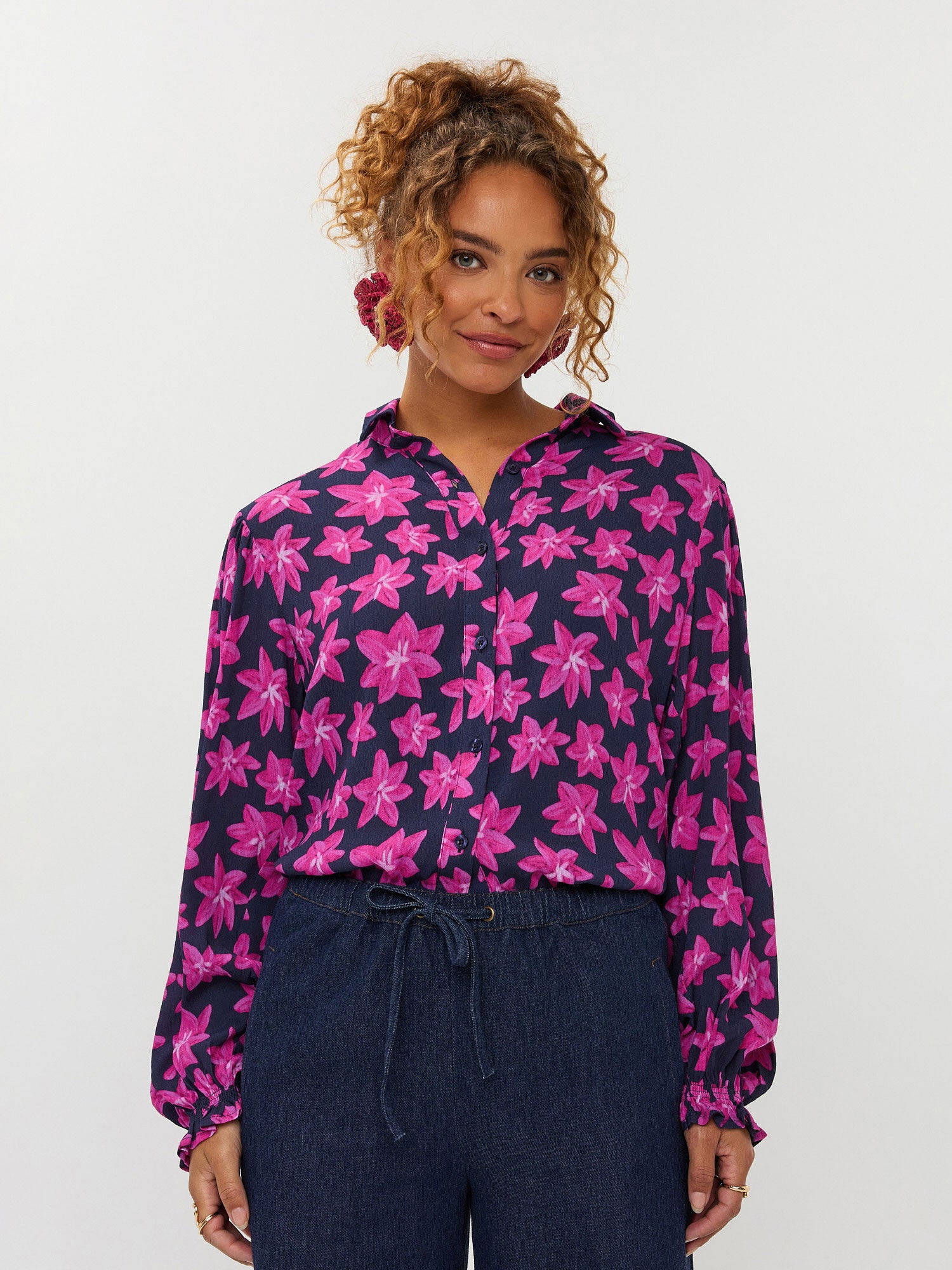Blouse Alyssa brengt kleur en elegantie samen in één stijlvol item. Deze blouse heeft een losse, comfortabele pasvorm met een doorlopende knoopsluiting aan de voorkant. De lange mouwen zijn licht gepoft en afgewerkt met elastische ruches aan de manchetten, wat zorgt voor een speelse en vrouwelijke touch. De print geeft de blouse een frisse en trendy uitstraling, perfect voor iedere gelegenheid. De totale lengte van blouse Alyssa is 61 cm met een mouwlengte van 61 cm bij een maat S.
