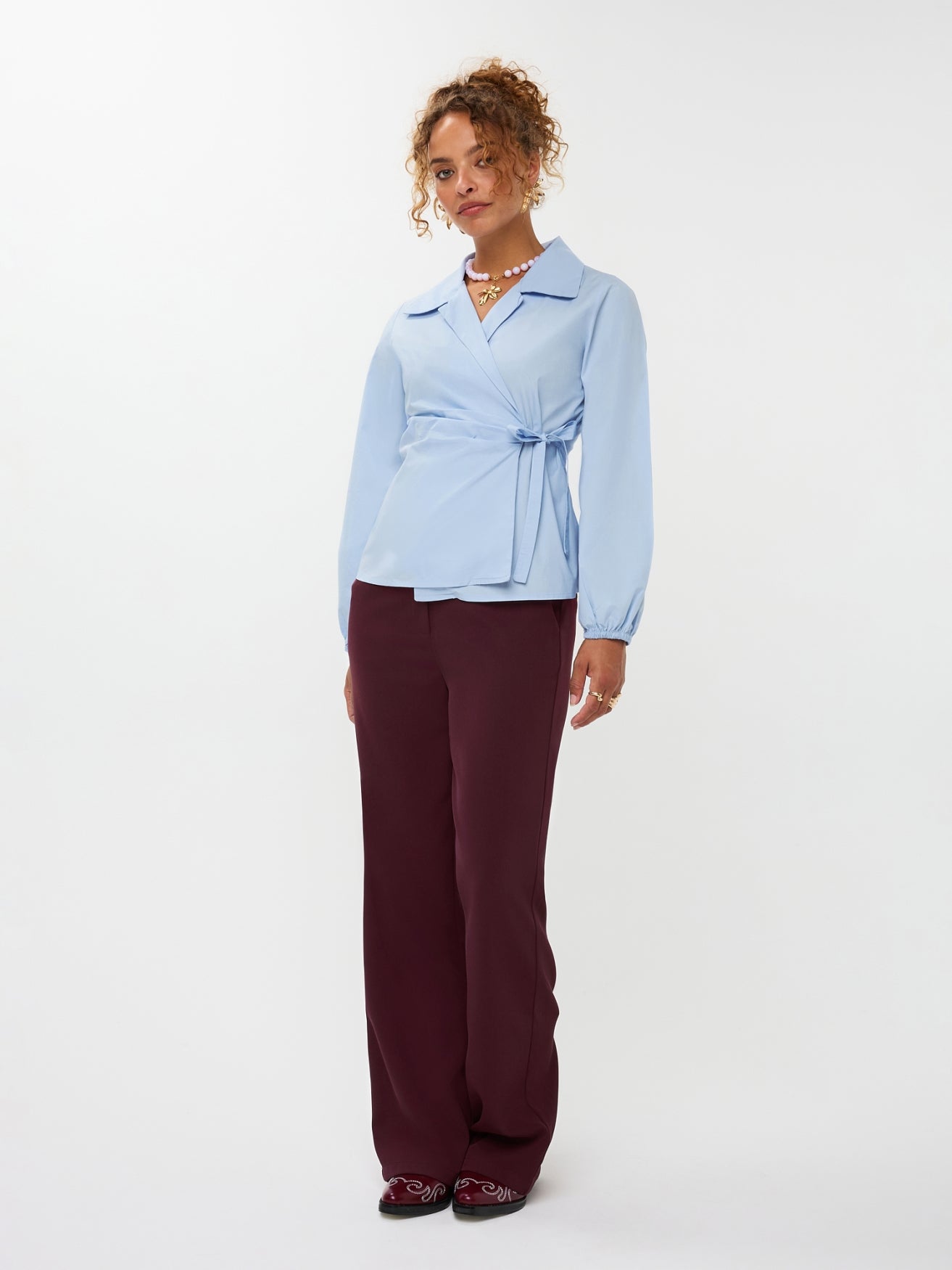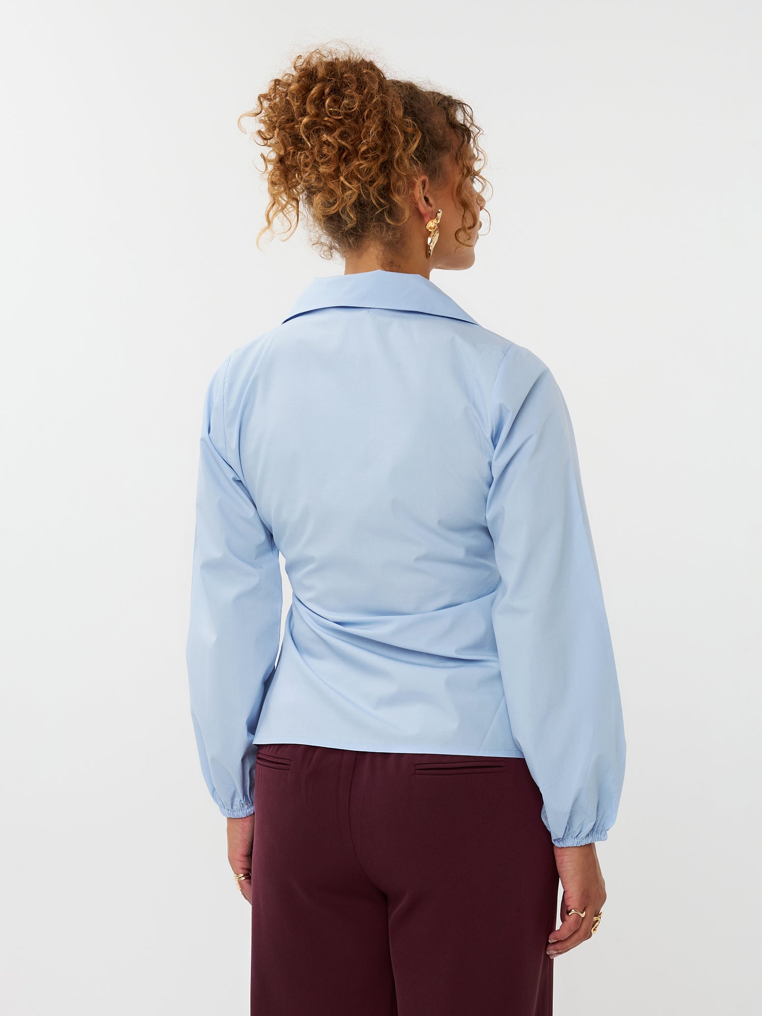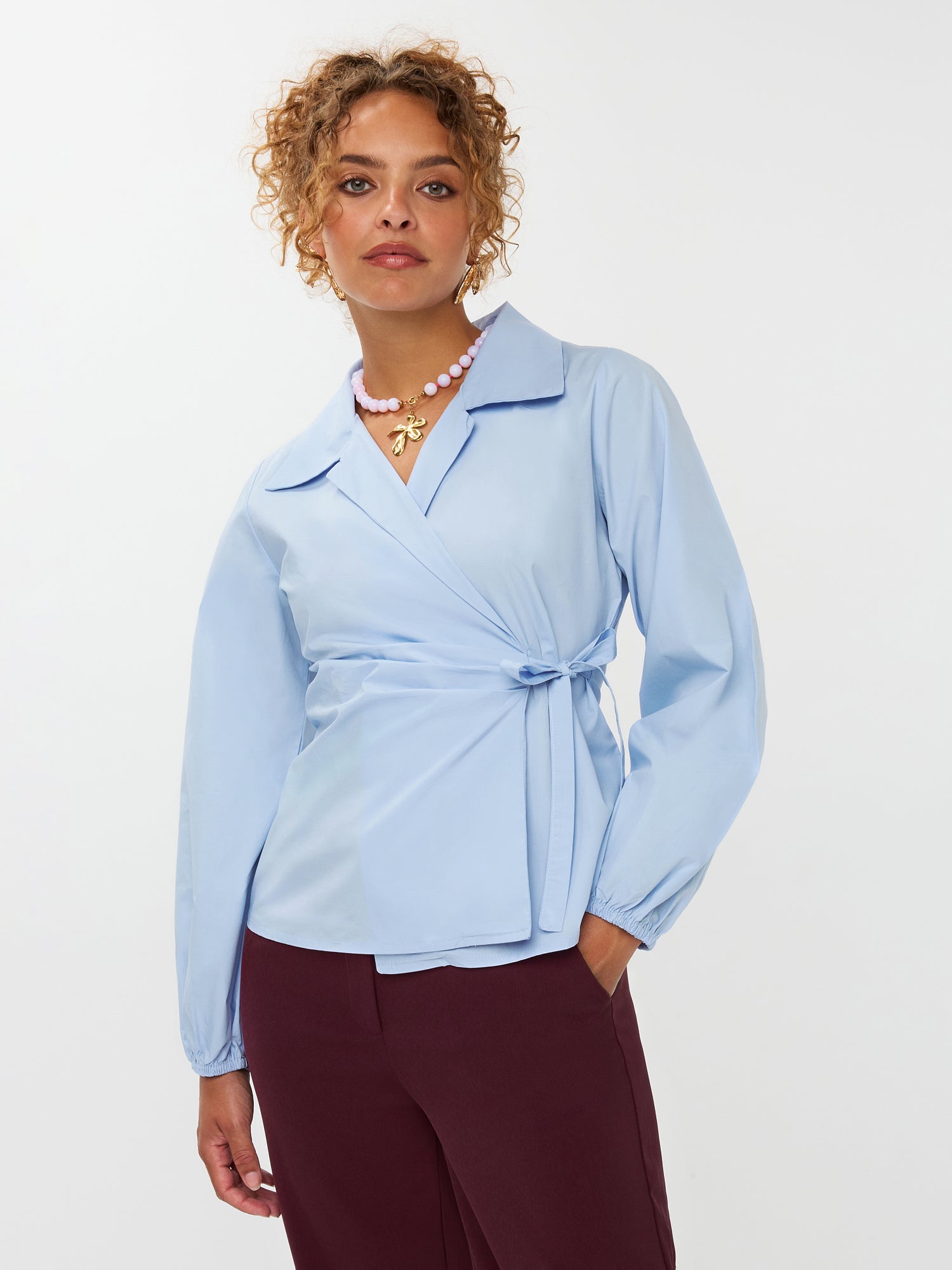 Blouse Christy is een chique en trendy toevoeging aan je garderobe. Deze blouse heeft een elegante wikkelpasvorm met strikceintuur in de taille, waardoor je een mooi vrouwelijk silhouet creëert. De klassieke kraag en lange mouwen met subtiele plooidetail aan de manchetten geven het item een verfijnde uitstraling. De gladde katoenmix zorgt voor ultiem draagcomfort en maakt deze blouse geschikt voor zowel zakelijke als casual gelegenheden. De totale lengte van blouse Christy is 62 cm met een mouwlengte van 61 cm bij een maat S.