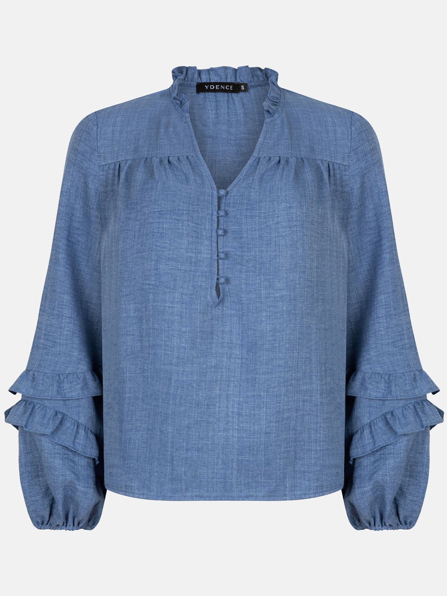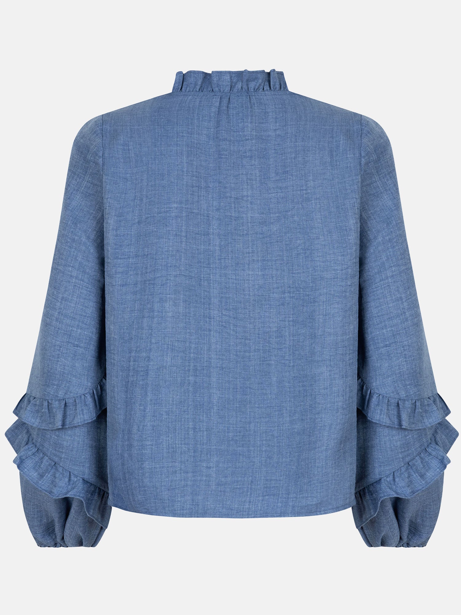 Blouse Jacky is een romantische en elegante blouse met verfijnde details. Deze blouse heeft een losse pasvorm met een subtiel opstaand ruffle kraagje en een halve knoopsluiting aan de voorkant. De lange mouwen zijn afgewerkt met dubbele ruches, wat zorgt voor een speelse en vrouwelijke touch. Dankzij de lichte stof draagt Jacky comfortabel en stijlvol, geschikt voor elke gelegenheid. De totale lengte van blouse Jacky is 60,5 cm met een mouwlengte van 61 cm bij een maat S.