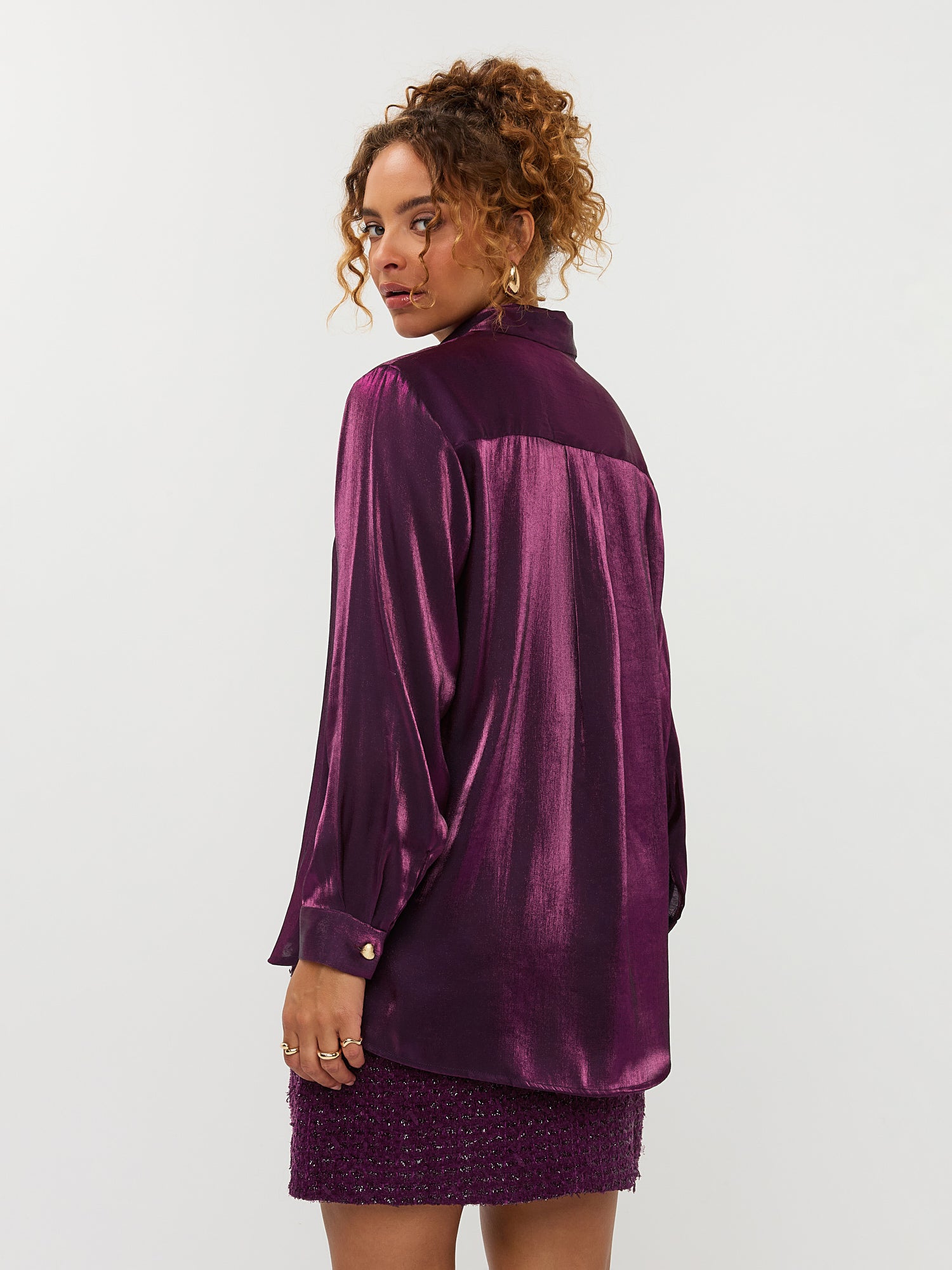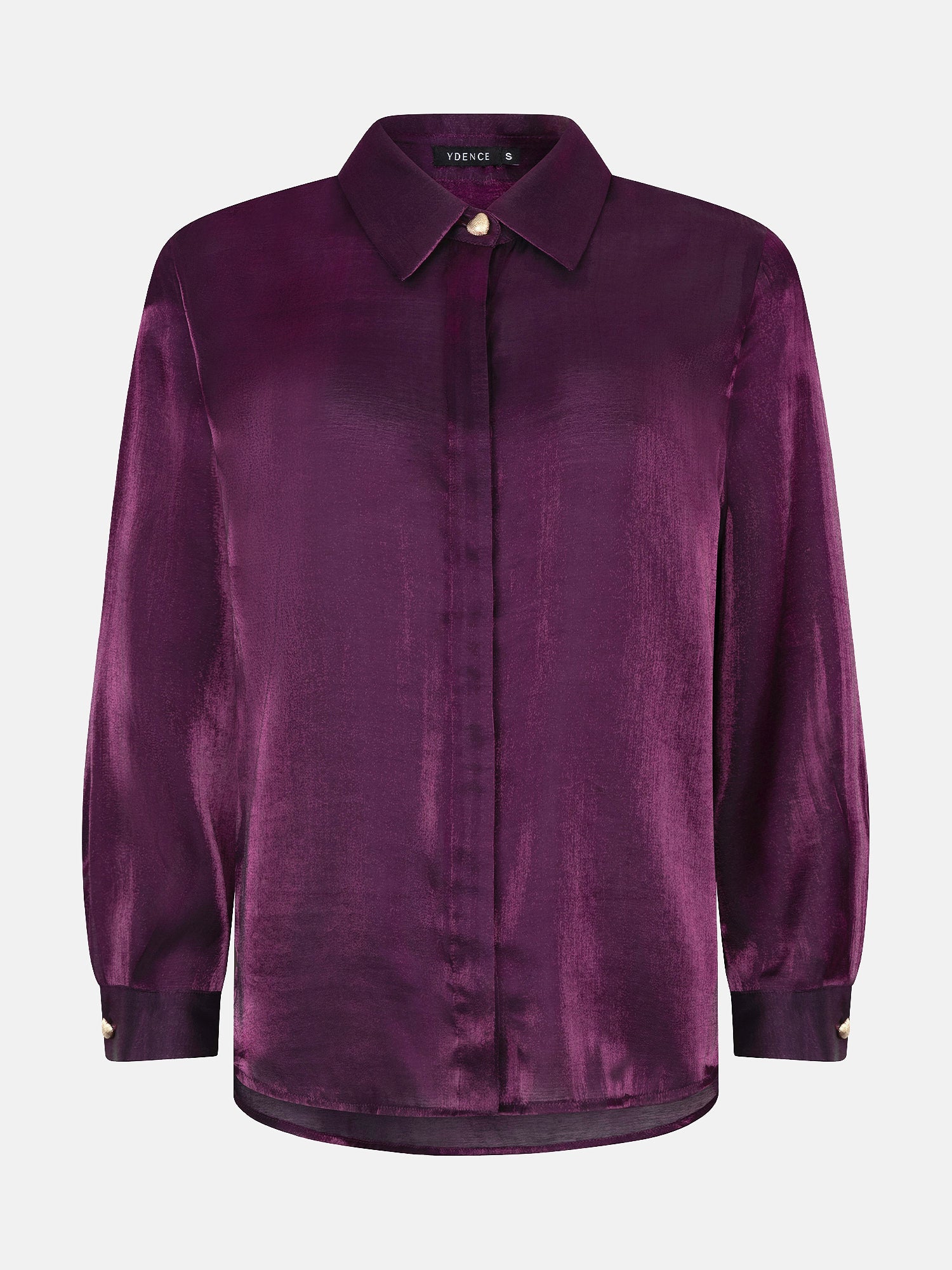 Blouse Lindsey is een elegante blouse met een luxueuze glans. De blouse heeft een rechte, lange pasvorm, klassieke kraag en een verborgen knoopsluiting aan de voorkant. De lange mouwen zijn afgewerkt met manchetten en hartjesknopen, waardoor Lindsey zowel zakelijk als feestelijk gedragen kan worden. De mouwlengte is 58,5 cm, de bodylength aan de voorkant 63 cm en aan de achterkant 74 cm bij maat S.