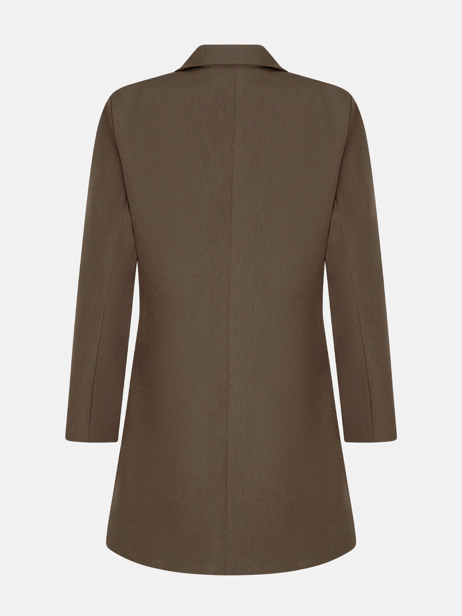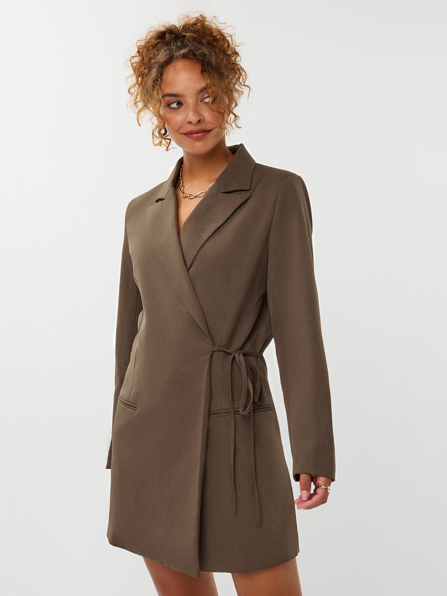 Dress April is een elegante blazerjurk met lange mouwen en een klassieke reverskraag. De jurk sluit als wikkeljurk met 2 knopen aan de binnenkant en een strik in de rechterzij als detail. De totale lengte van de blazerjurk is 88 cm en de mouwlengte is 61 cm bij een maat S.
