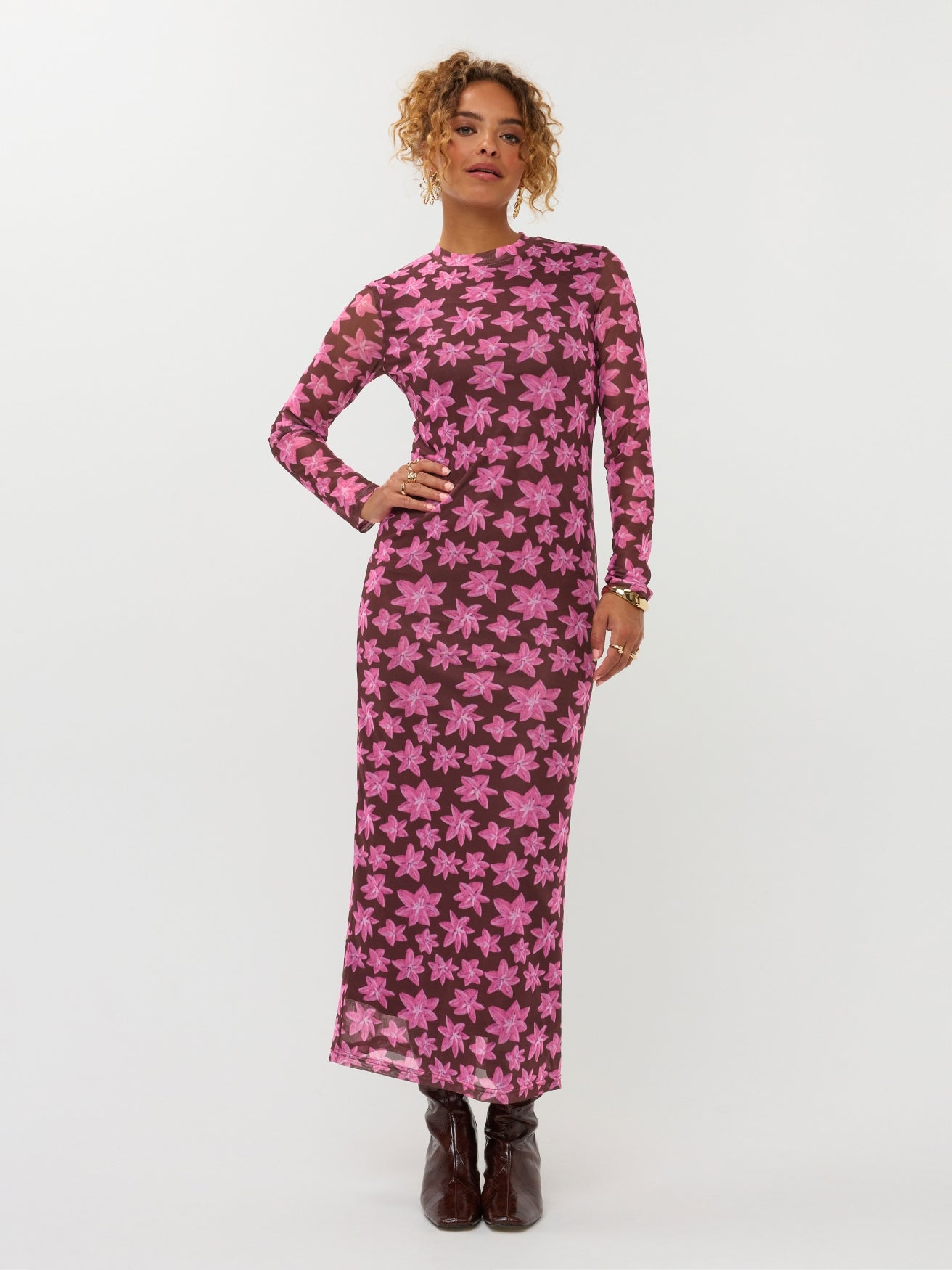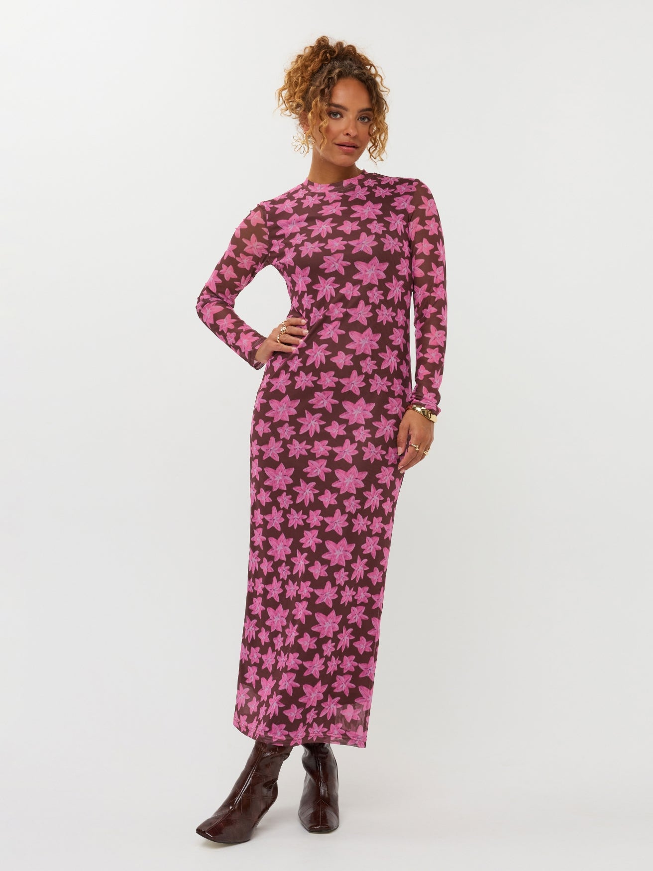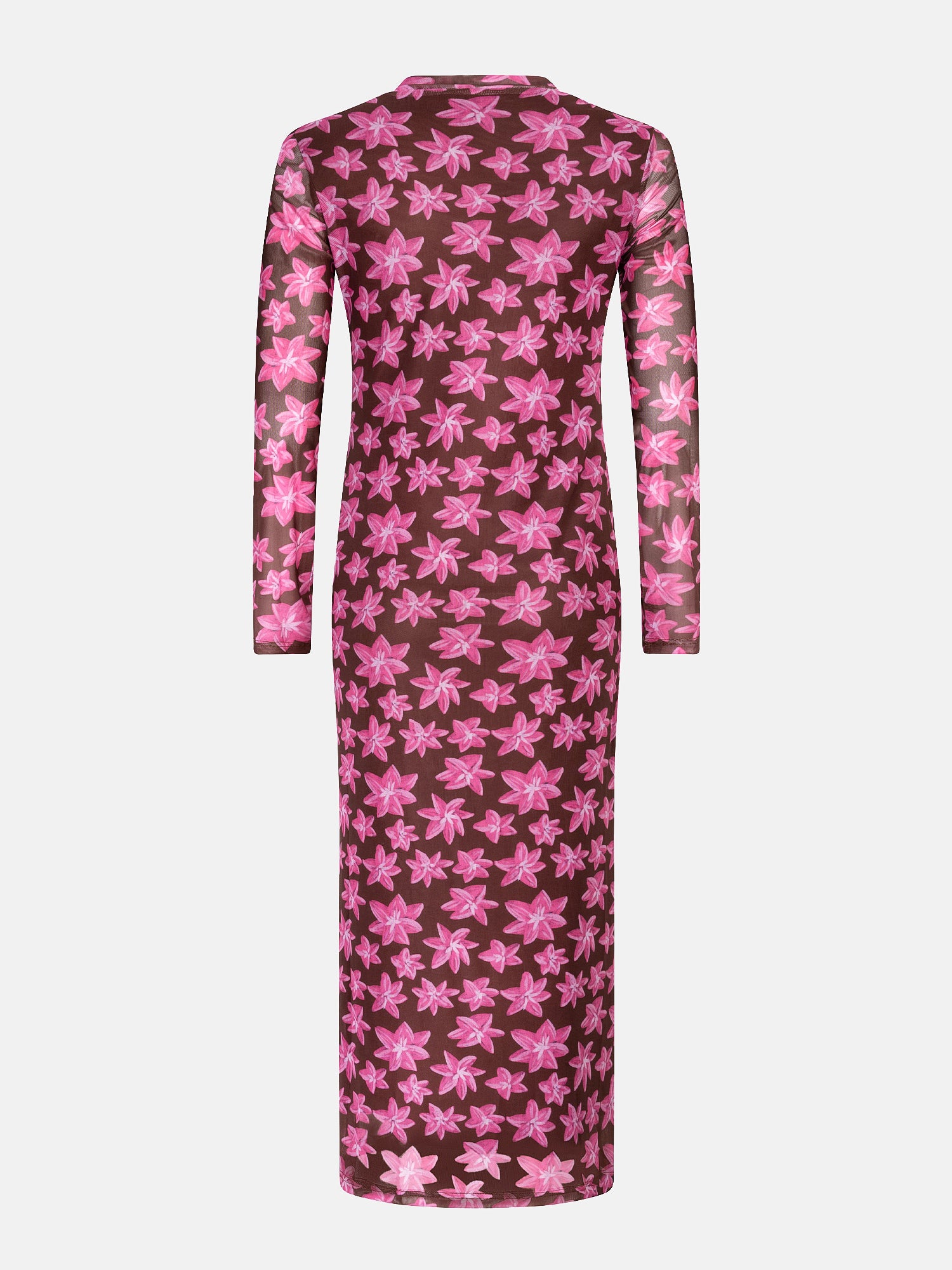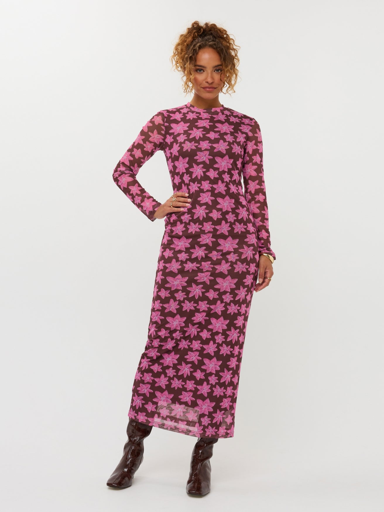 Dress Lauren is een mesh maxi-jurk met lange mouwen en een aangesloten pasvorm. De jurk heeft een hoge hals en een speelse bloemenprint die zorgt voor een opvallende, vrouwelijke look. Perfect om zowel casual als feestelijk te dragen. De jurk is volledig gevoerd, terwijl de lange mouwen semi-transparant zijn en zorgen voor een luchtige, speelse uitstraling. De mouwlengte is 63 cm en de bodylength 136 cm bij maat S.