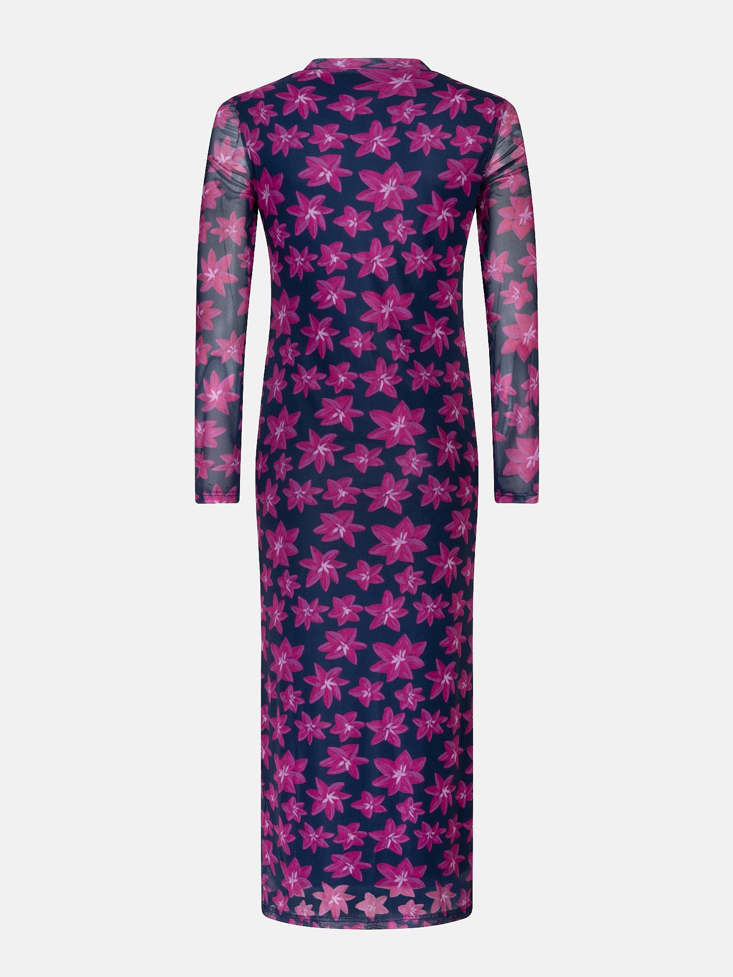 Dress Lauren is een mesh maxi-jurk met lange mouwen en een aangesloten pasvorm. De jurk heeft een hoge hals en een speelse bloemenprint die zorgt voor een opvallende, vrouwelijke look. Perfect om zowel casual als feestelijk te dragen. De jurk is volledig gevoerd, terwijl de lange mouwen semi-transparant zijn en zorgen voor een luchtige, speelse uitstraling. De mouwlengte is 63 cm en de bodylength 136 cm bij maat S.