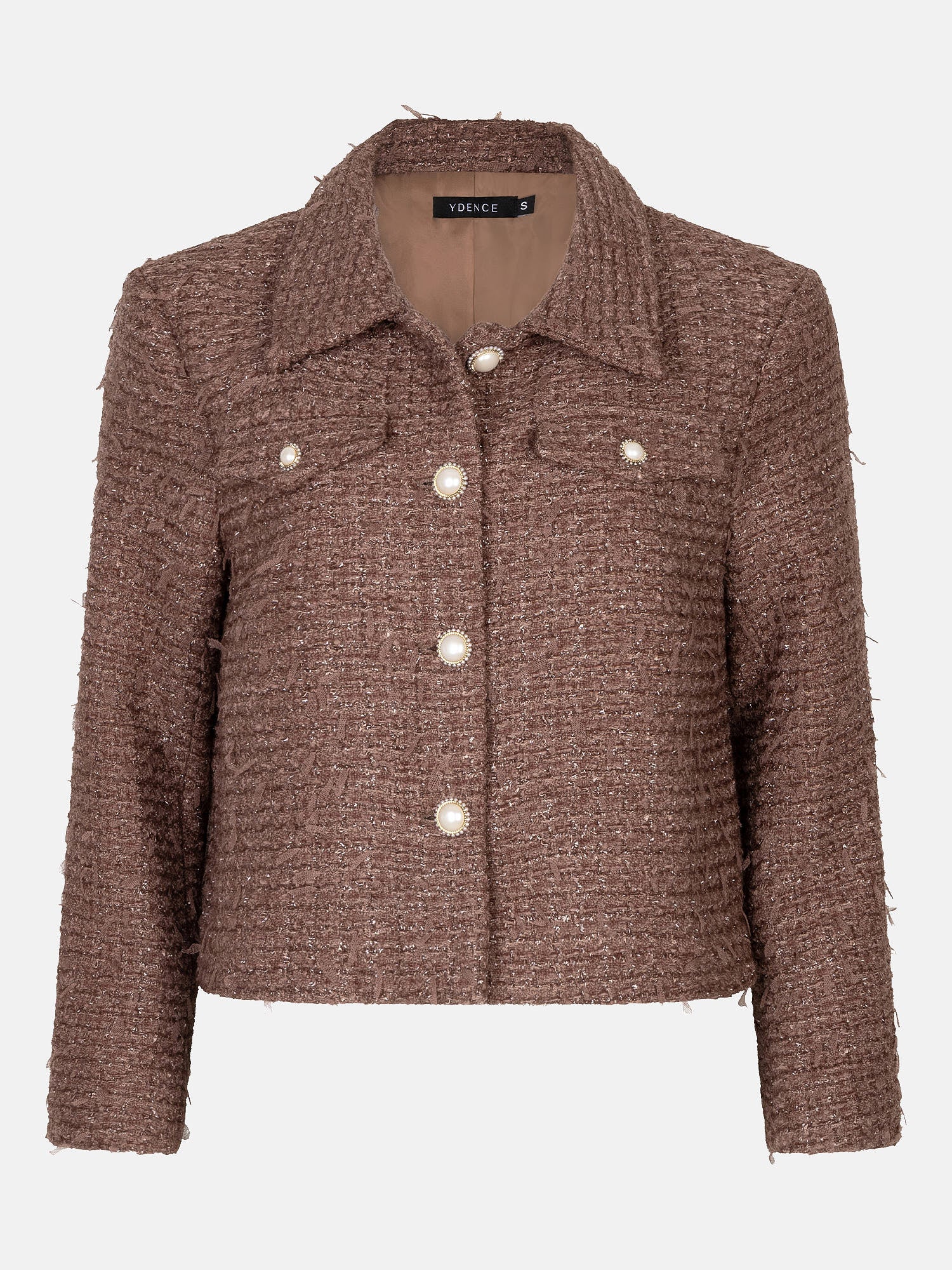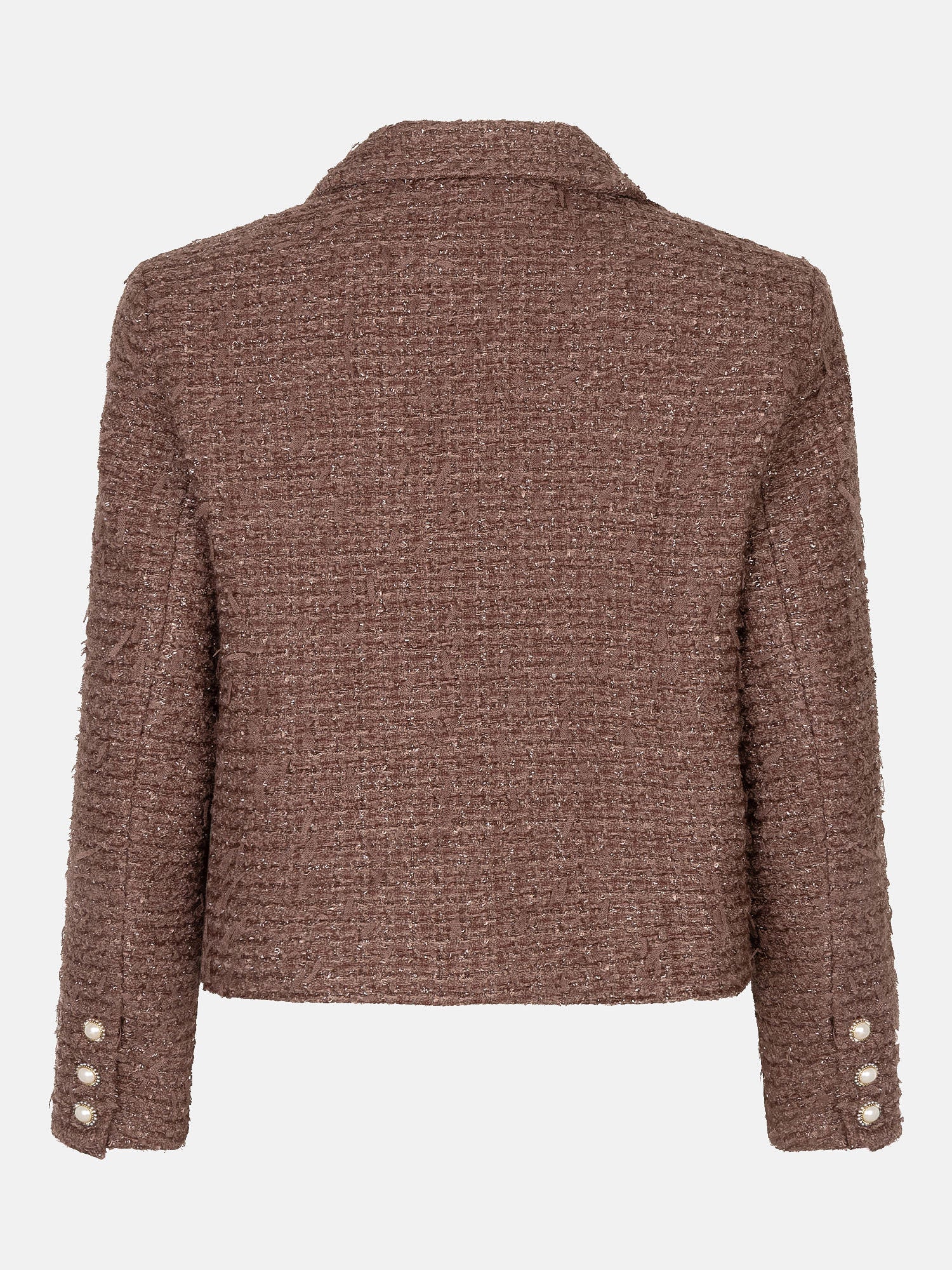 Jacket Wiske is een elegant jasje met een korte, rechte pasvorm. Het jasje heeft een klassieke kraag en wordt gekenmerkt door de opvallende parelknopen, die zorgen voor een vrouwelijke en verfijnde uitstraling. Het grove geweven materiaal heeft subtiel lurex in de stof verweven, wat zorgt voor een chique glimmertje en extra luxe uitstraling. De mouwlengte is 58,5 cm en de bodylength 53 cm bij maat S.