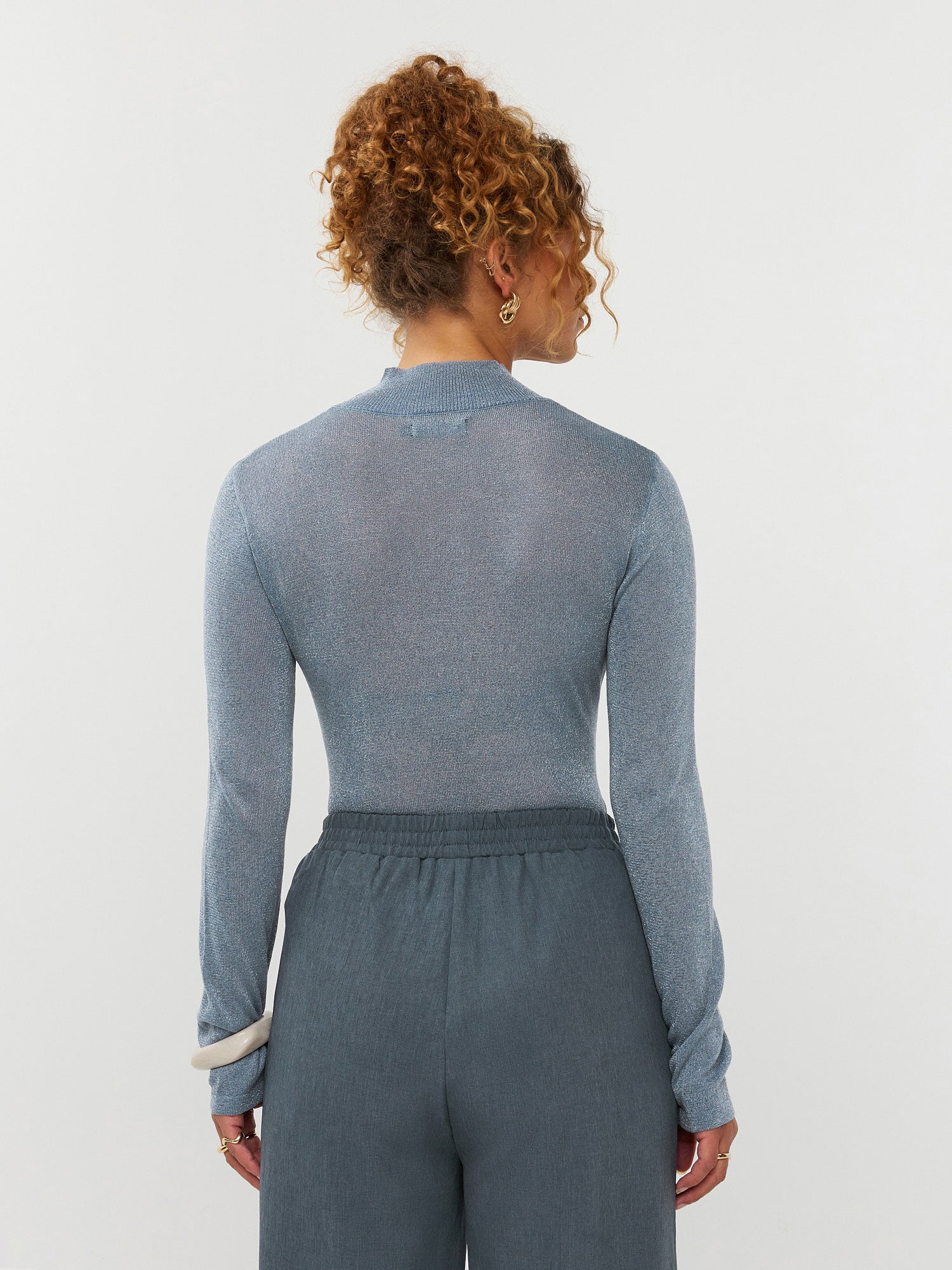 Top Lotte is een elegante, semi-transparante top met een subtiele glitter. De top heeft een aangesloten pasvorm, lange mouwen en een hoge ronde hals met subtiel kraagje. Dankzij de licht doorschijnende stof is Lotte perfect om te dragen met een mooie bralette of als layering piece onder een blazer of trui. De mouwlengte is 62 cm en de bodylength is 60 cm bij maat S.