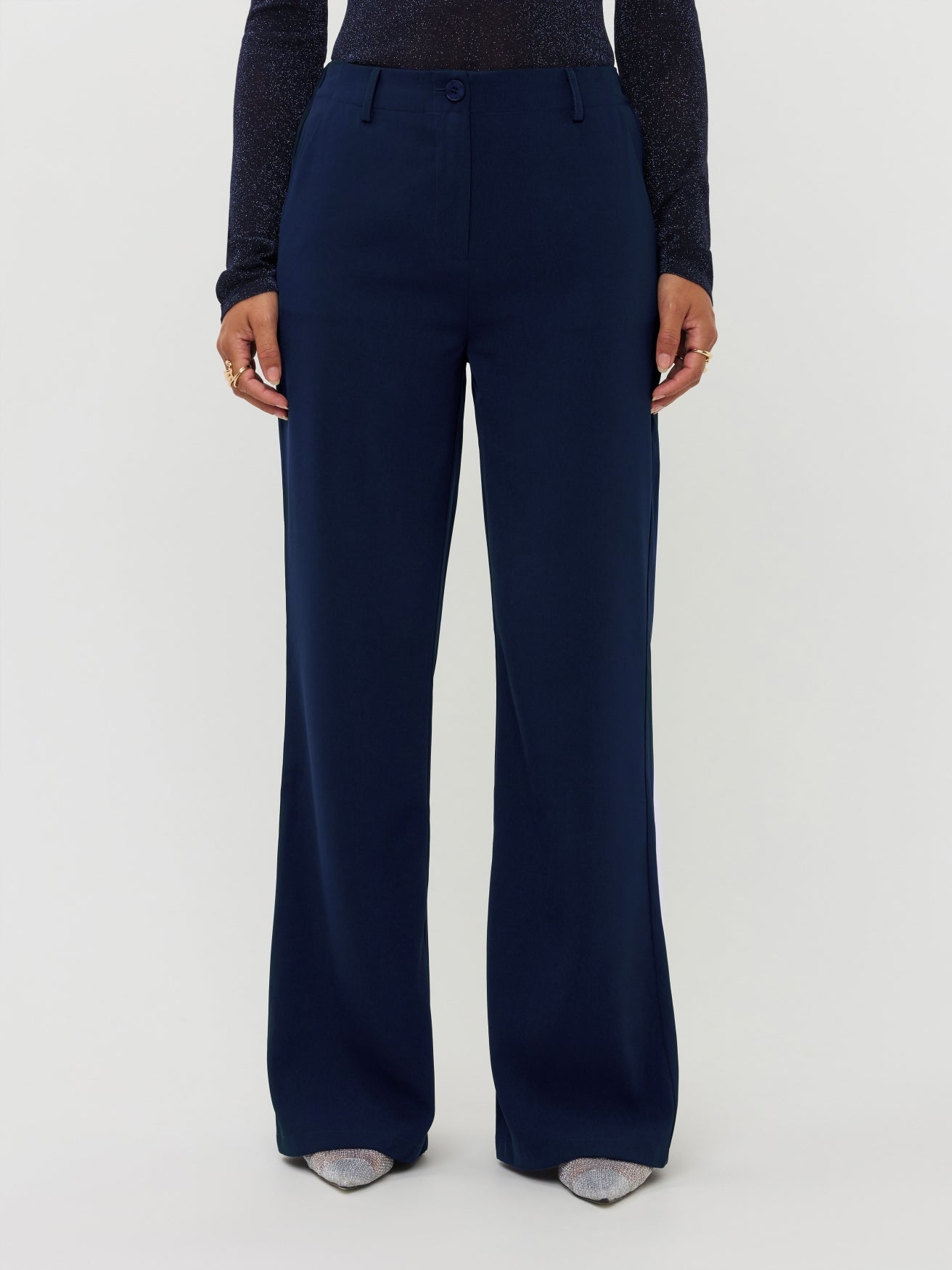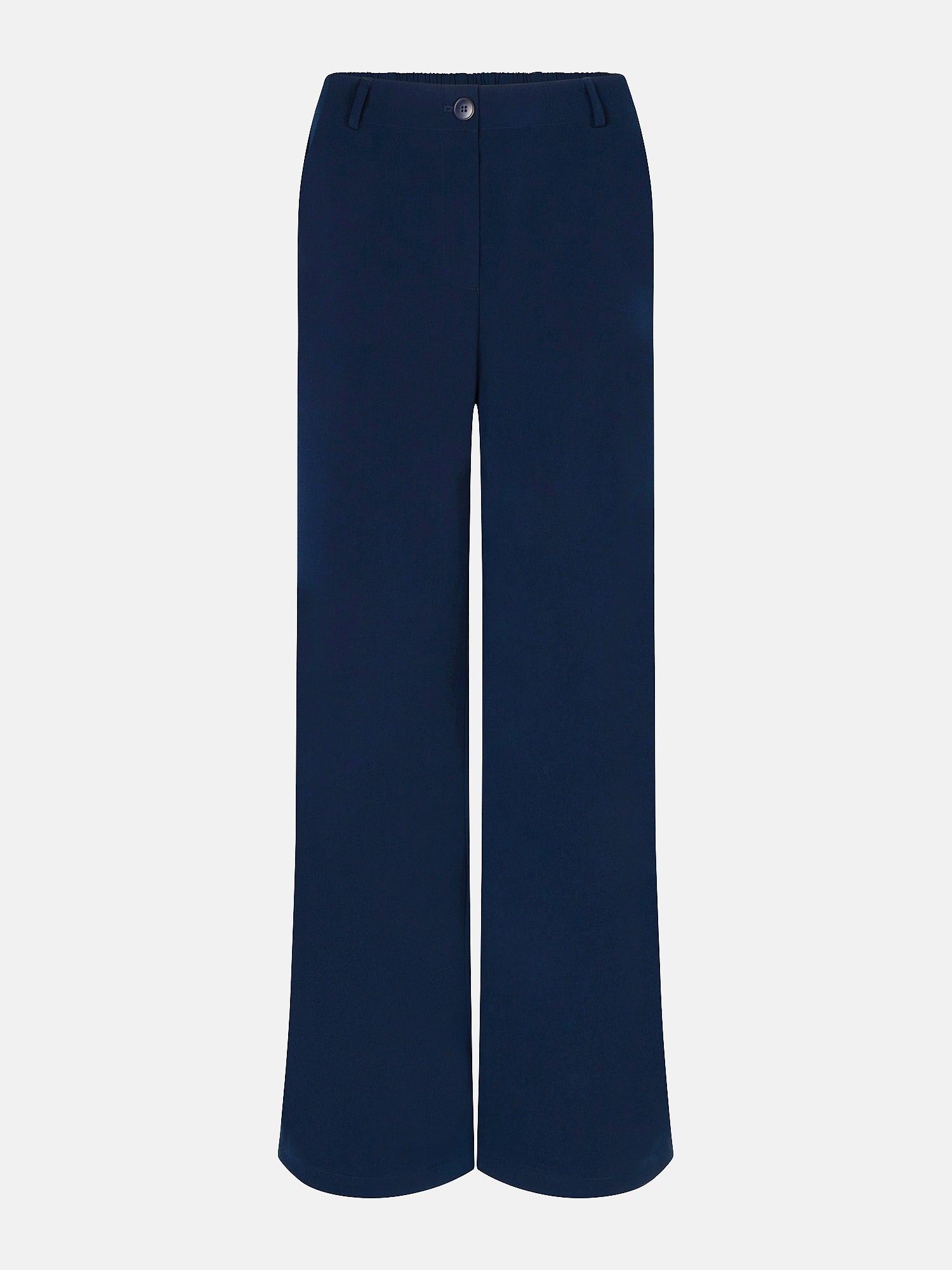Pants Solange is een elegante pantalon met wijde, rechte pijpen. De pantalon heeft steekzakken aan de voorzijde en faux zakken aan de achterzijde. De pantalon sluit met een knoop- en ritssluiting en heeft een elastische tailleband aan de achterzijde. De pantalon is gemaakt van een rijke stof bestaande uit polyester en rayon. De lengtemaat is 108 cm en de binnenbeen lengte is 80 cm bij een maat S.