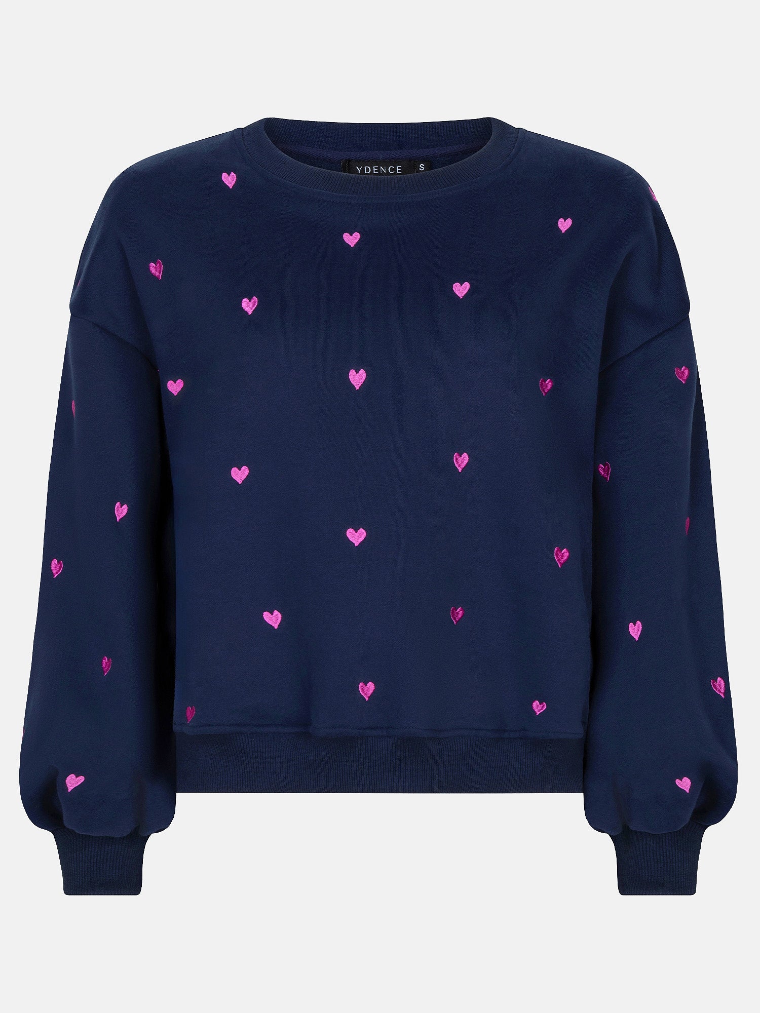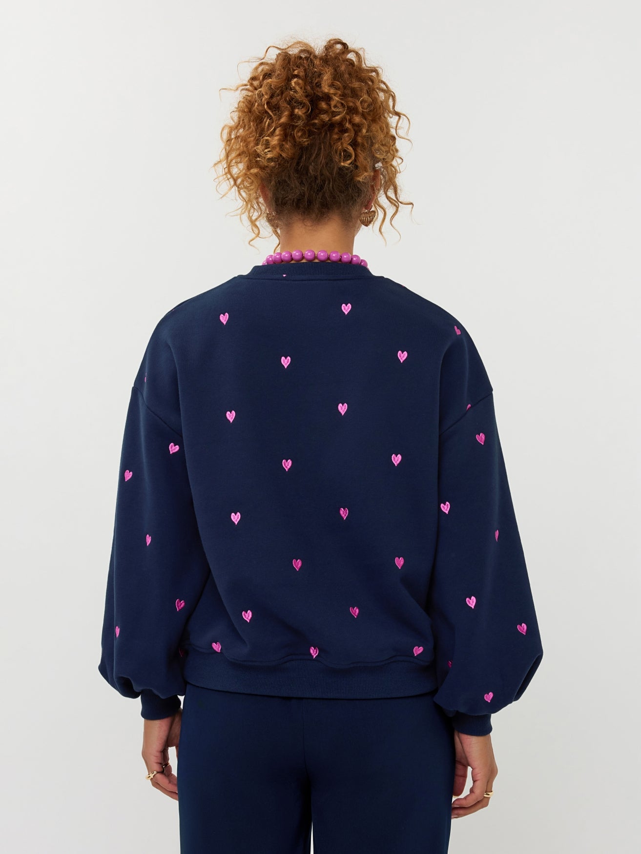 Sweater Hearts is een zachte sweater met een speels en romantisch karakter. Het ontwerp wordt gekenmerkt door all-over geborduurde hartjes in contrasterende kleuren, die een vrolijke en liefdevolle uitstraling geven. De sweater heeft een comfortabele pasvorm met lange mouwen, een ronde hals en pofmouwen met boord. De mouwlengte is 51 cm en de bodylength 61cm bij maat S.