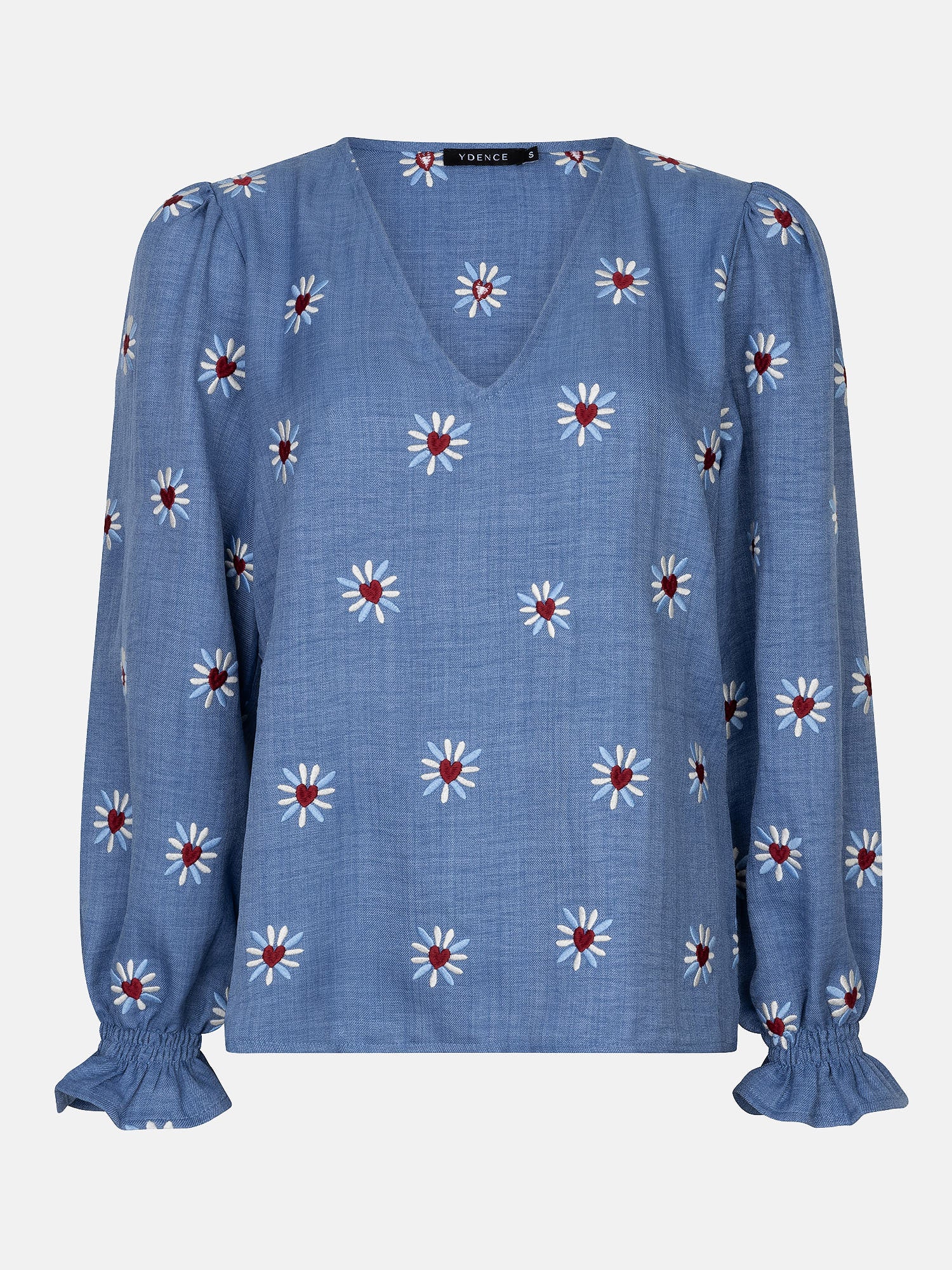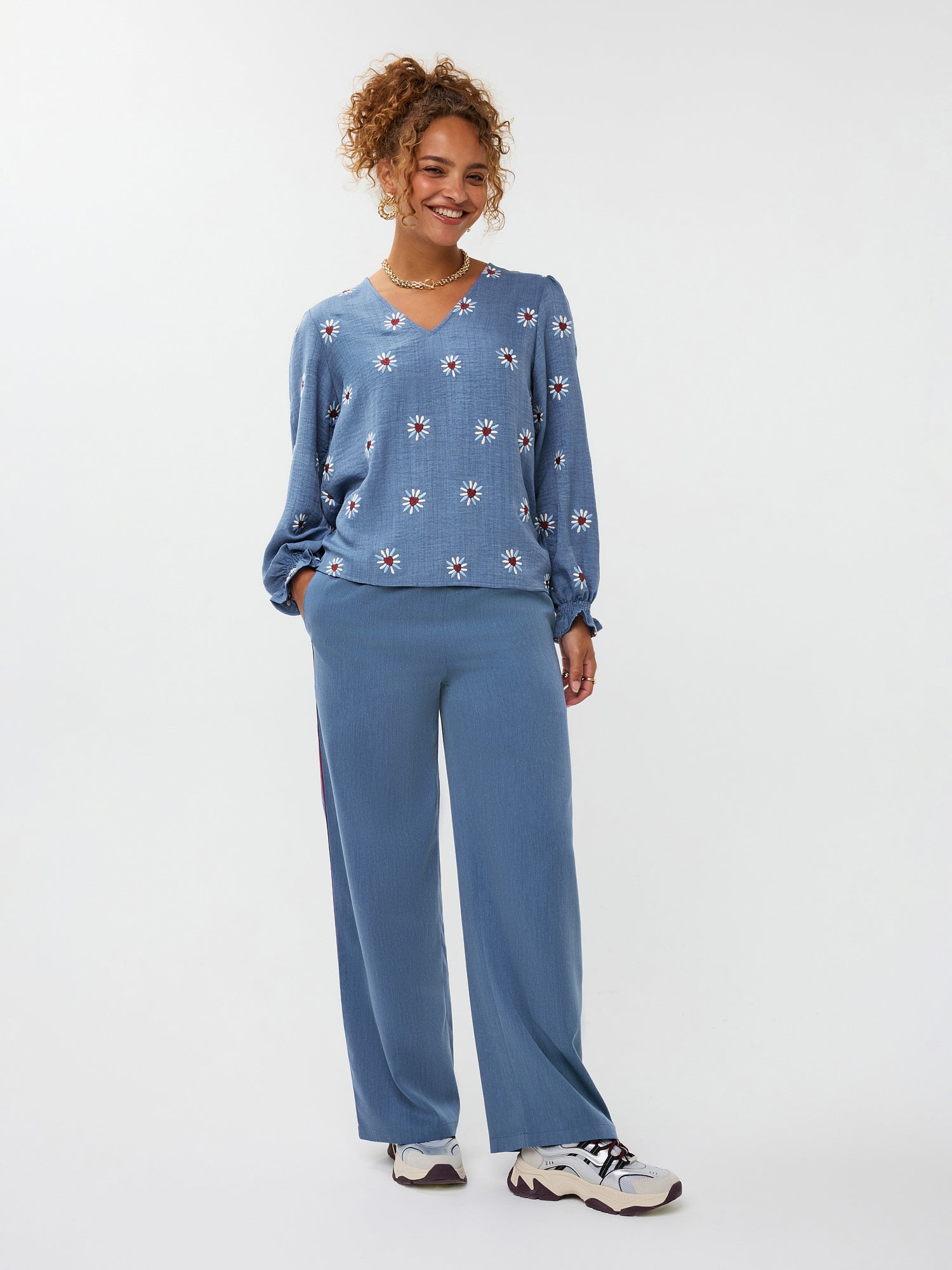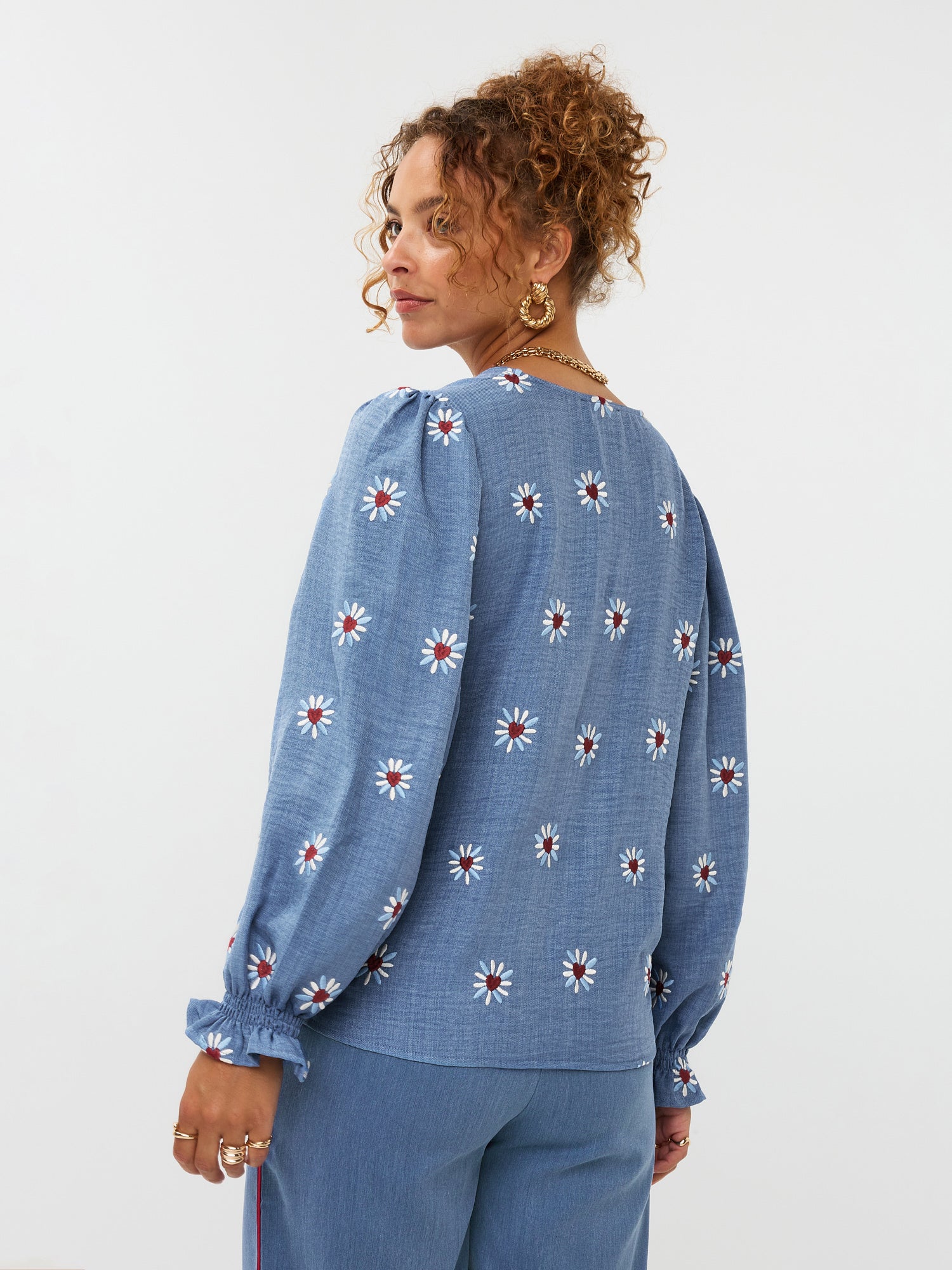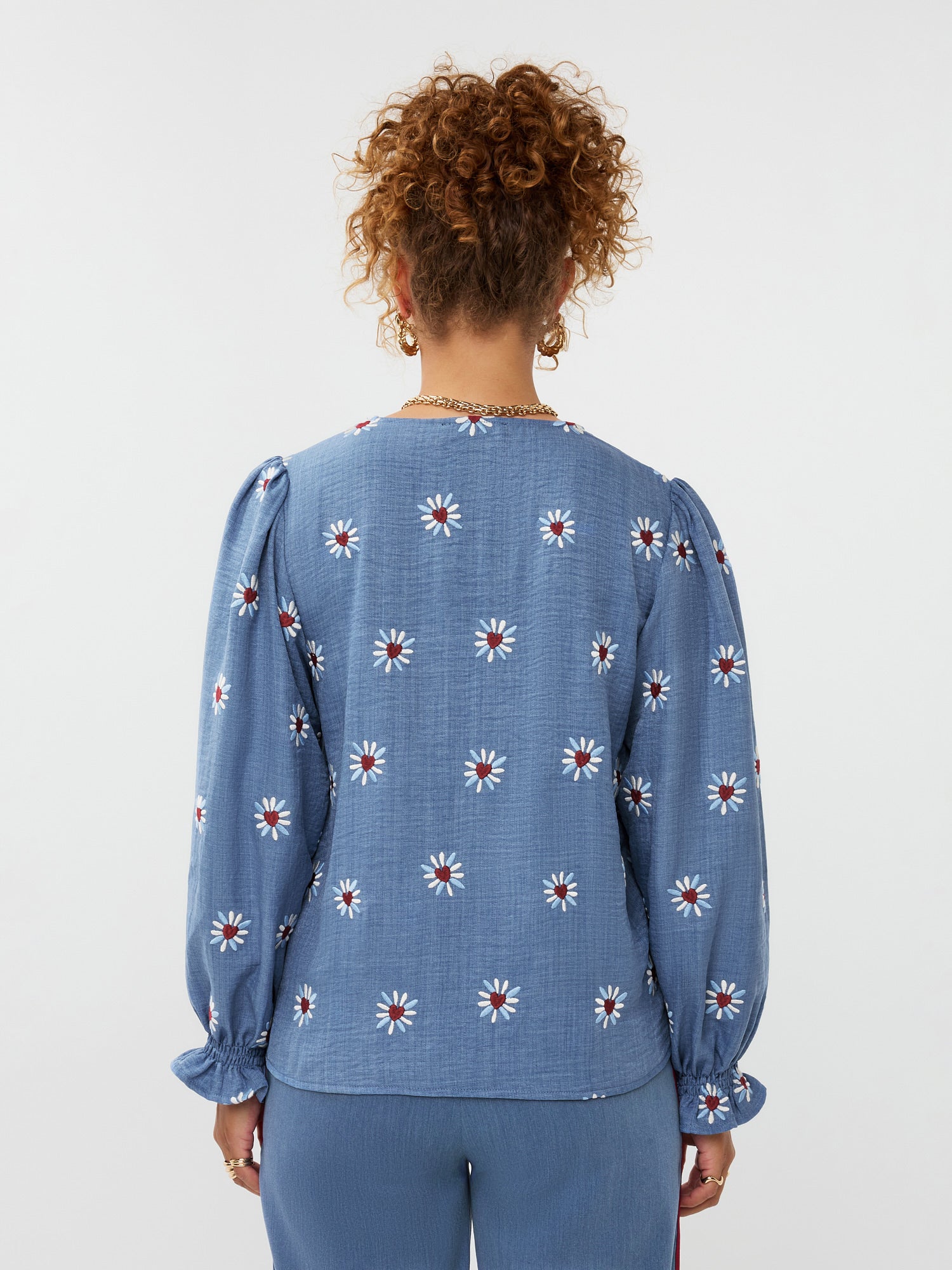 Top Philou is een vrolijke en vrouwelijke top die je look een speelse twist geeft. Deze blouse heeft een rechte, losse pasvorm met een diepe V-hals en lange mouwen. De elastische ruches aan de manchetten zorgen voor een charmant detail. Het all-over geborduurde bloemetjesspatroon voegt een frisse en speelse uitstraling toe aan het item. De totale lengte van top Philou is 62 cm met een mouwlengte van 62 cm bij een maat S.
